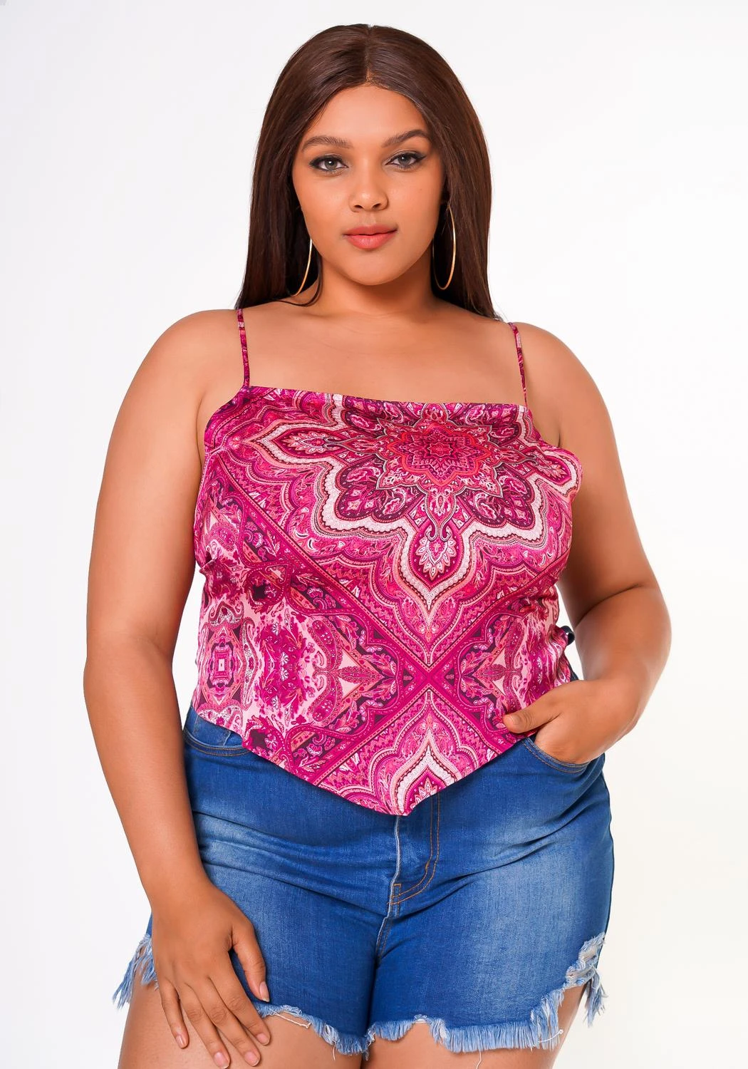 Lovely plus size women’s cami top in paisley pattern, straight neckline and v hemline.