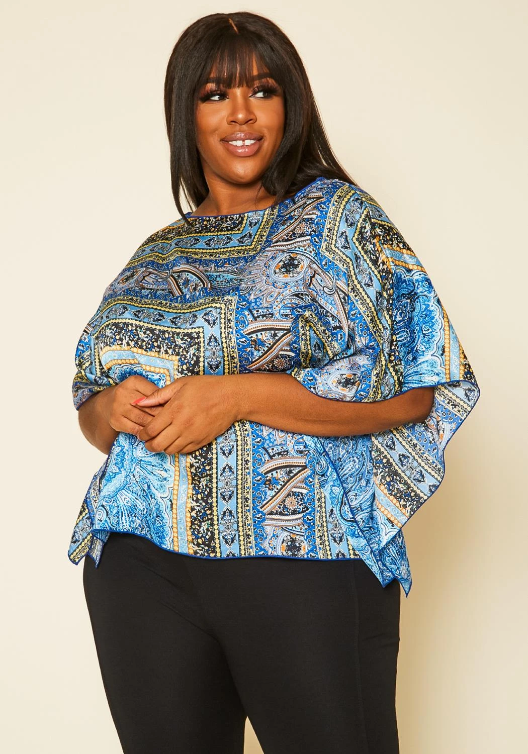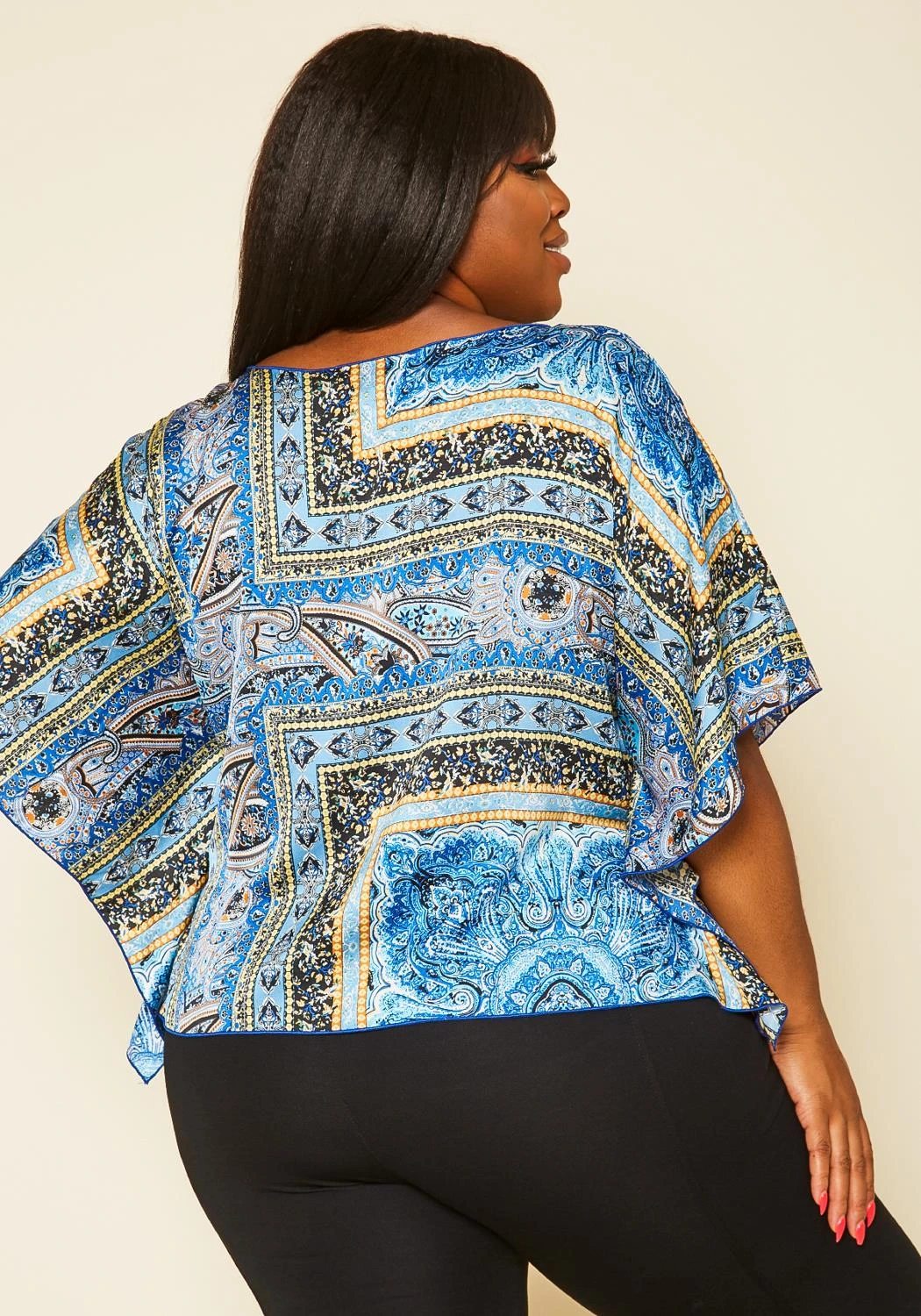 Plus size women’s paisley pattern top in dolman short sleeves and relaxed fitting.