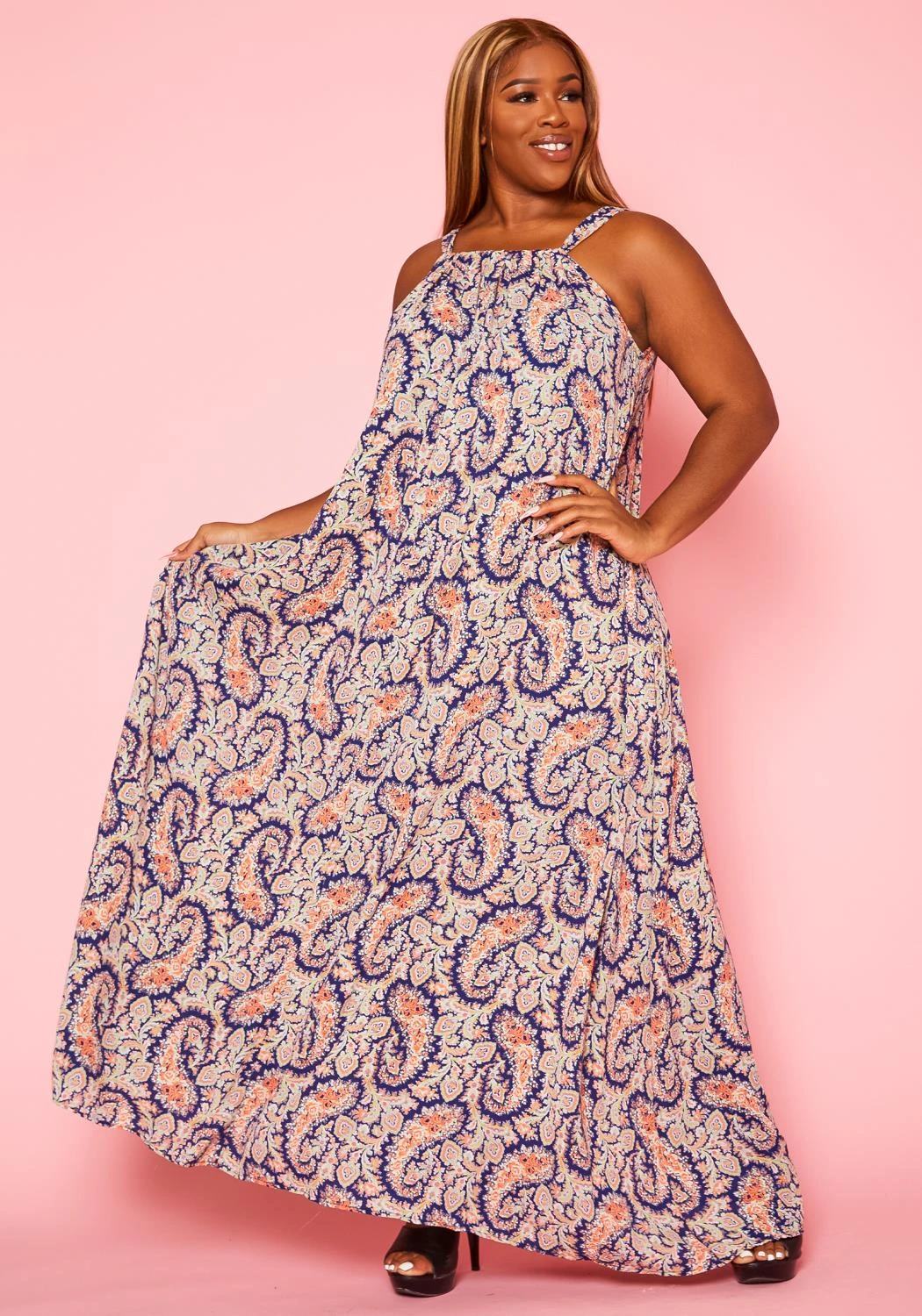 Delightful plus size women’s maxi dress in paisley pattern, sleeveless design, fit to flare end, pocket ascent and self tie closure.