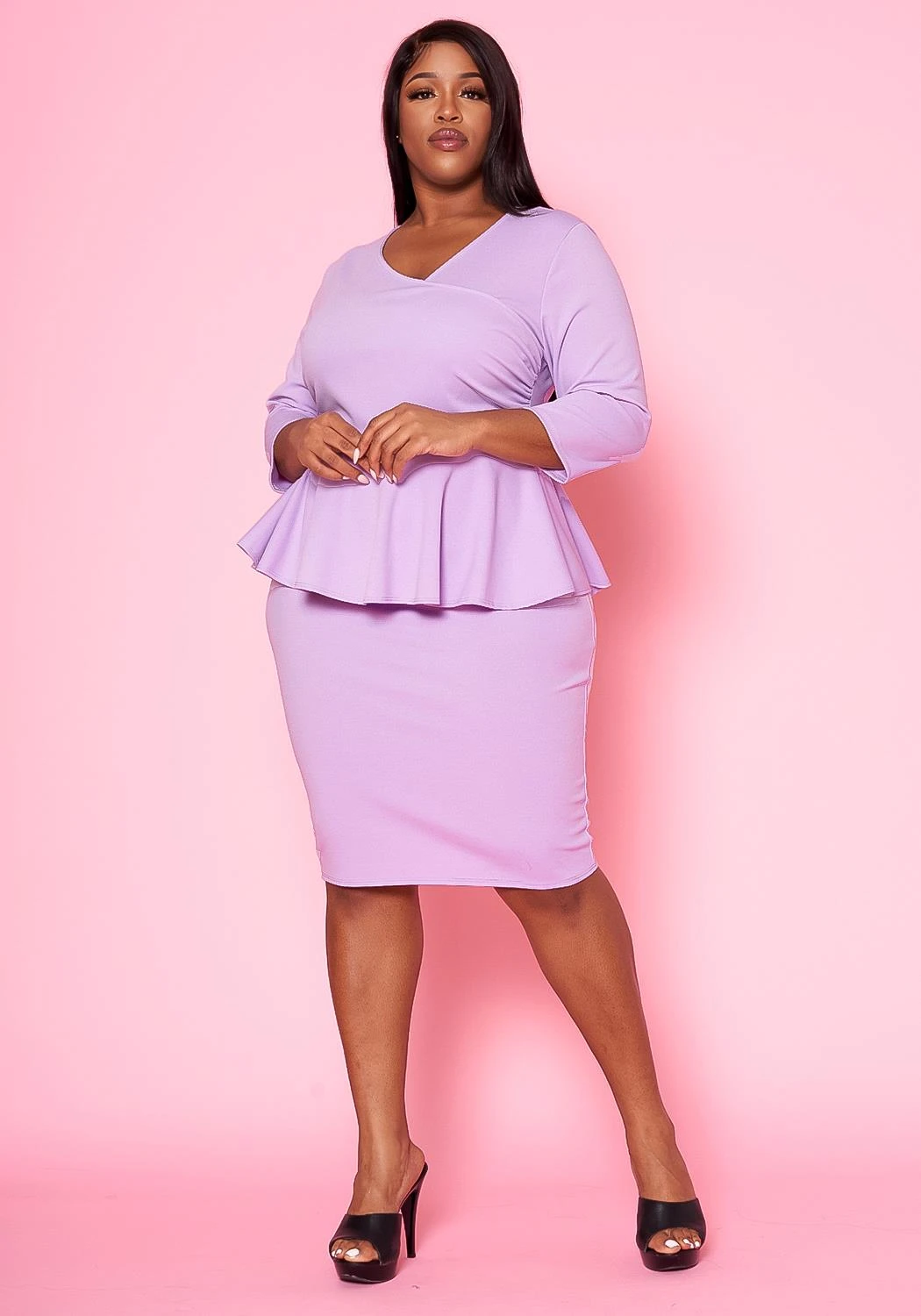 Sophisticated plus size women’s mini dress with peplum flare, v-neckline and 3/4 long sleeves.