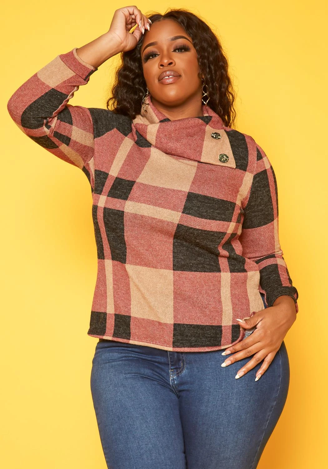 Plus size women’s plaid sweater with high neck asymmetric collar, fitted long sleeves and button details.