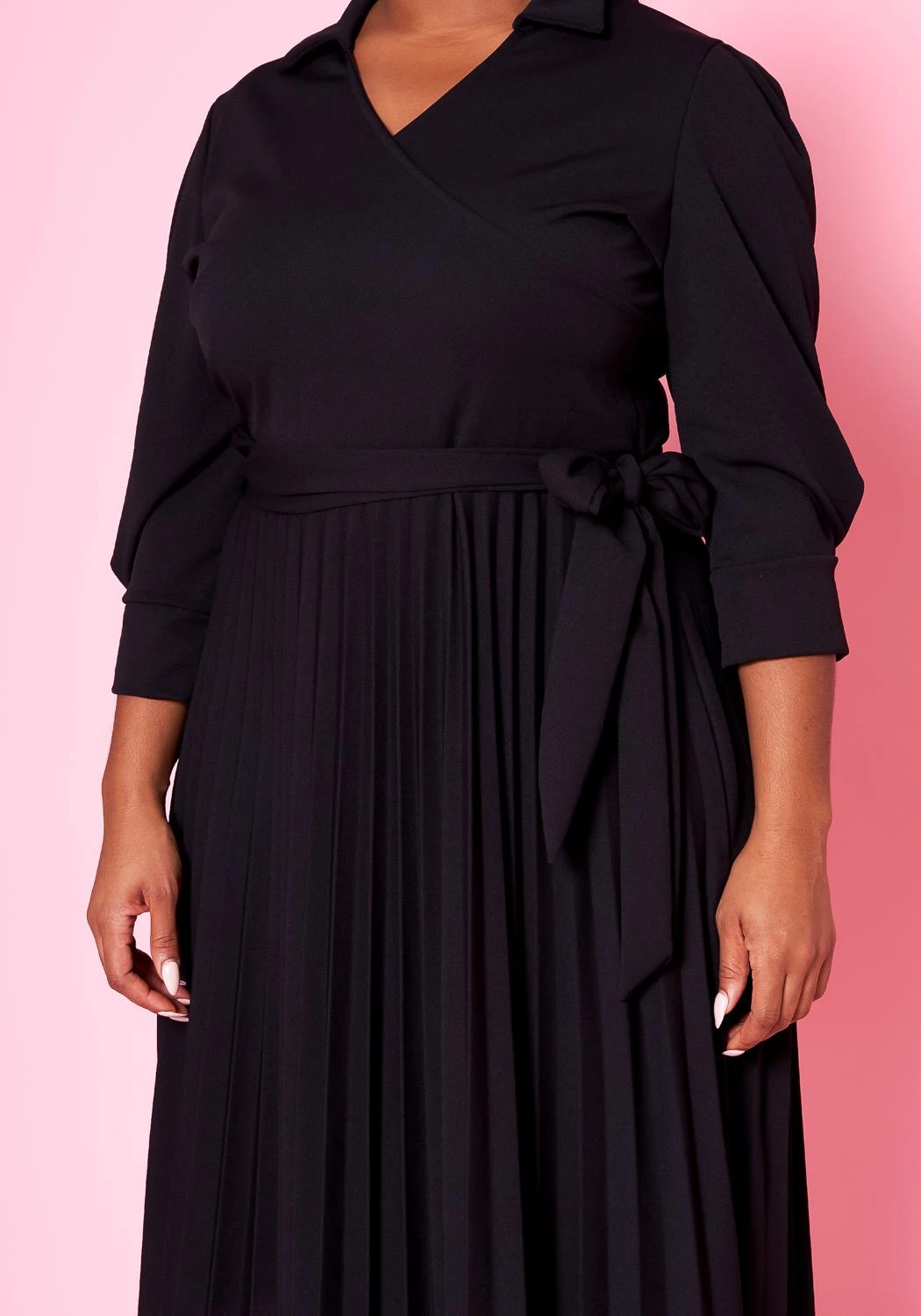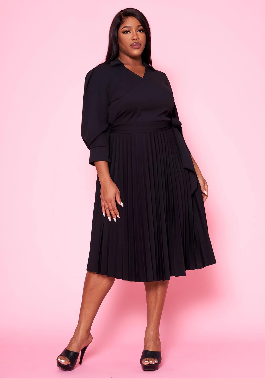 Effortless plus size women’s midi dress with pleated design, v-neck style, collar neckline, 3/4 long sleeves and waist tie ascent.