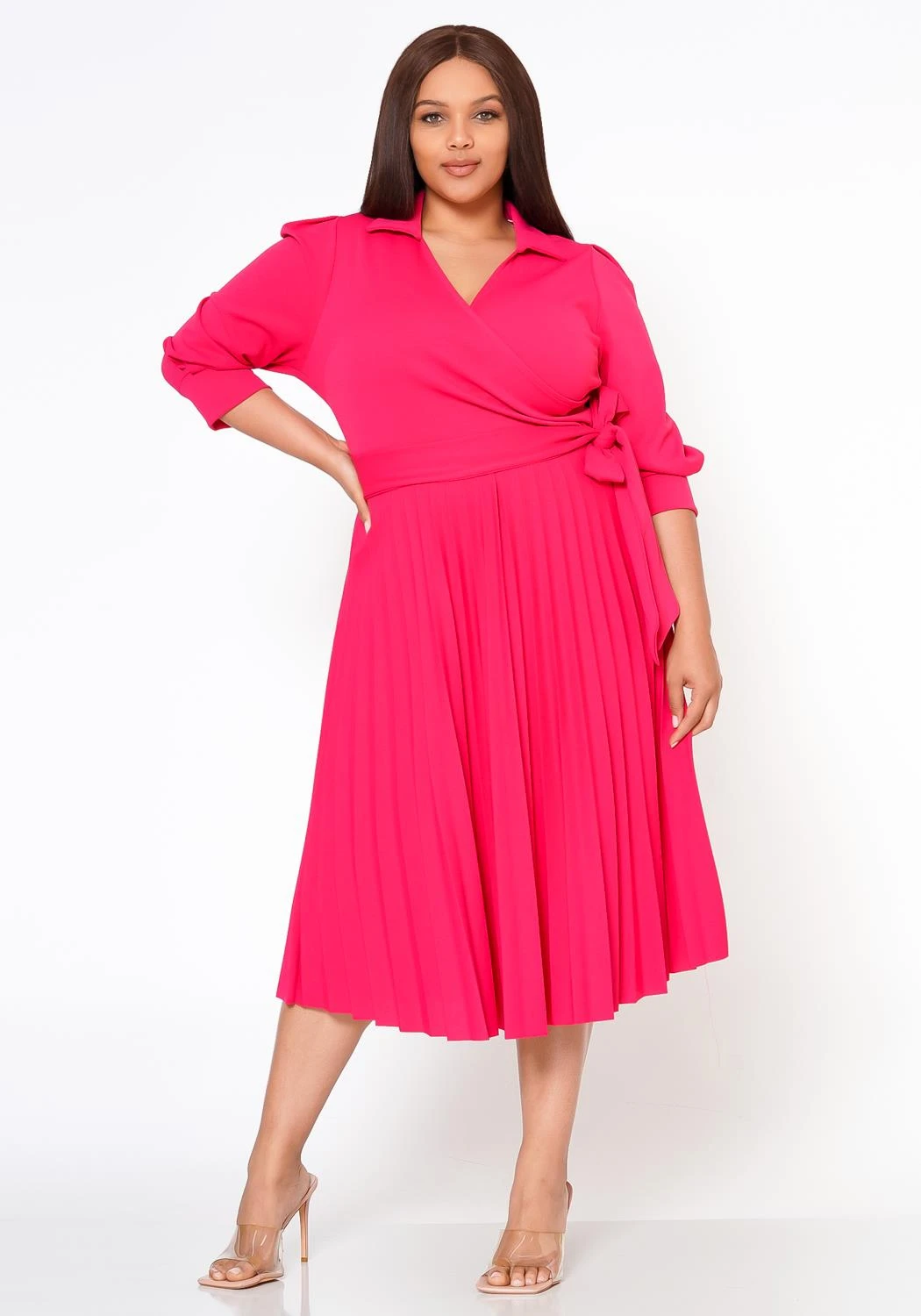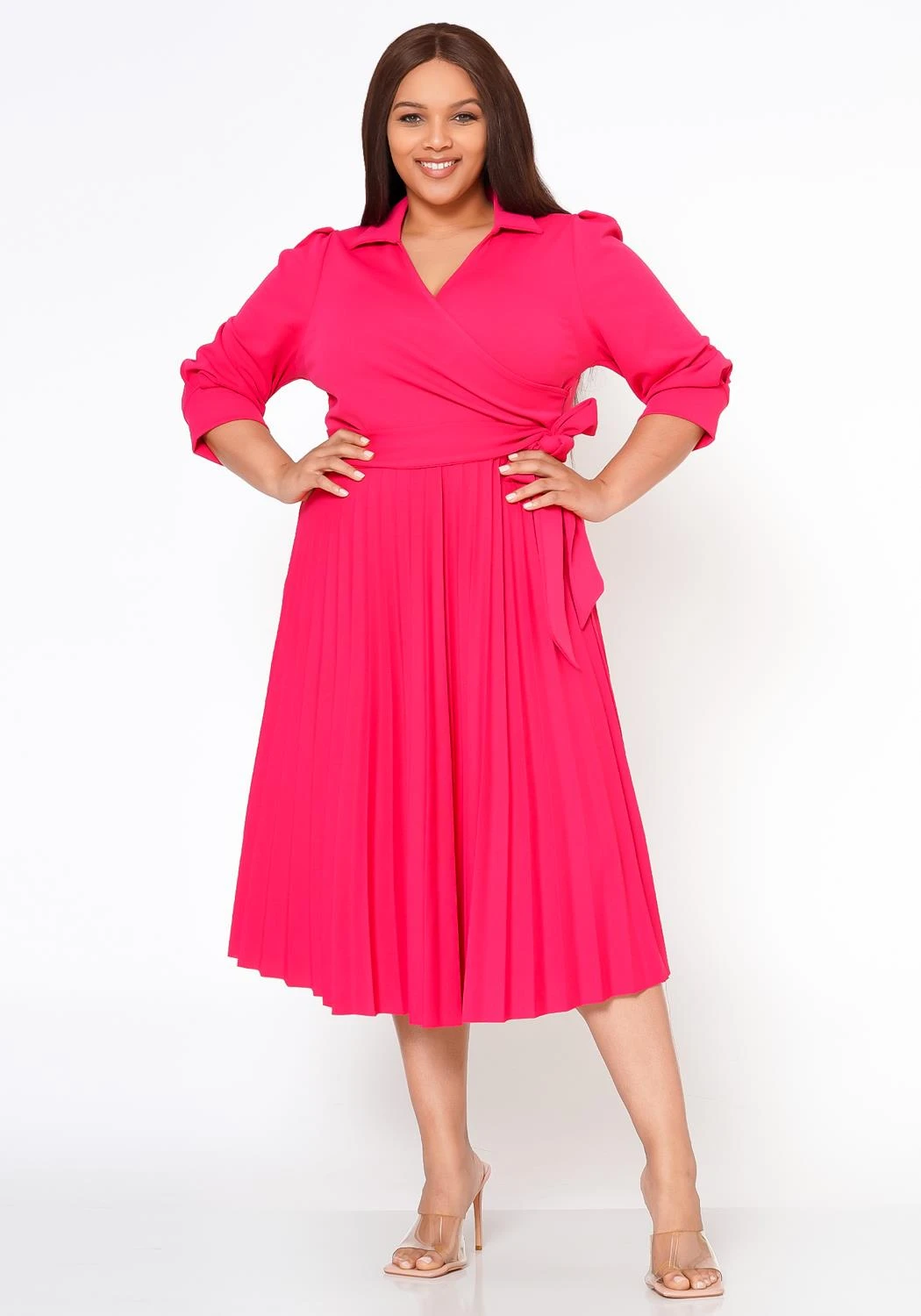 Effortless plus size women’s midi dress with pleated design, v-neck style, collar neckline, 3/4 long sleeves and waist tie ascent.