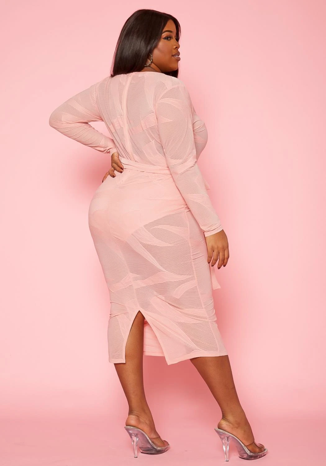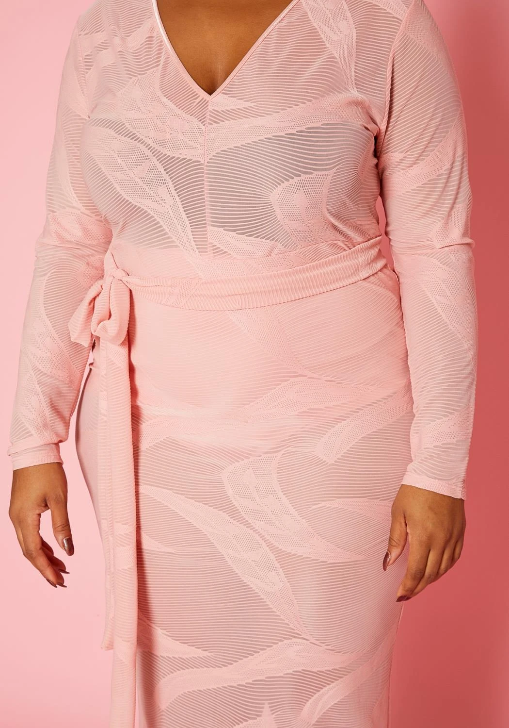 Fierce mesh midi dress for plus size women with subtle print design, v-neck style, fitted long sleeves, belted waistline and bottom lining.