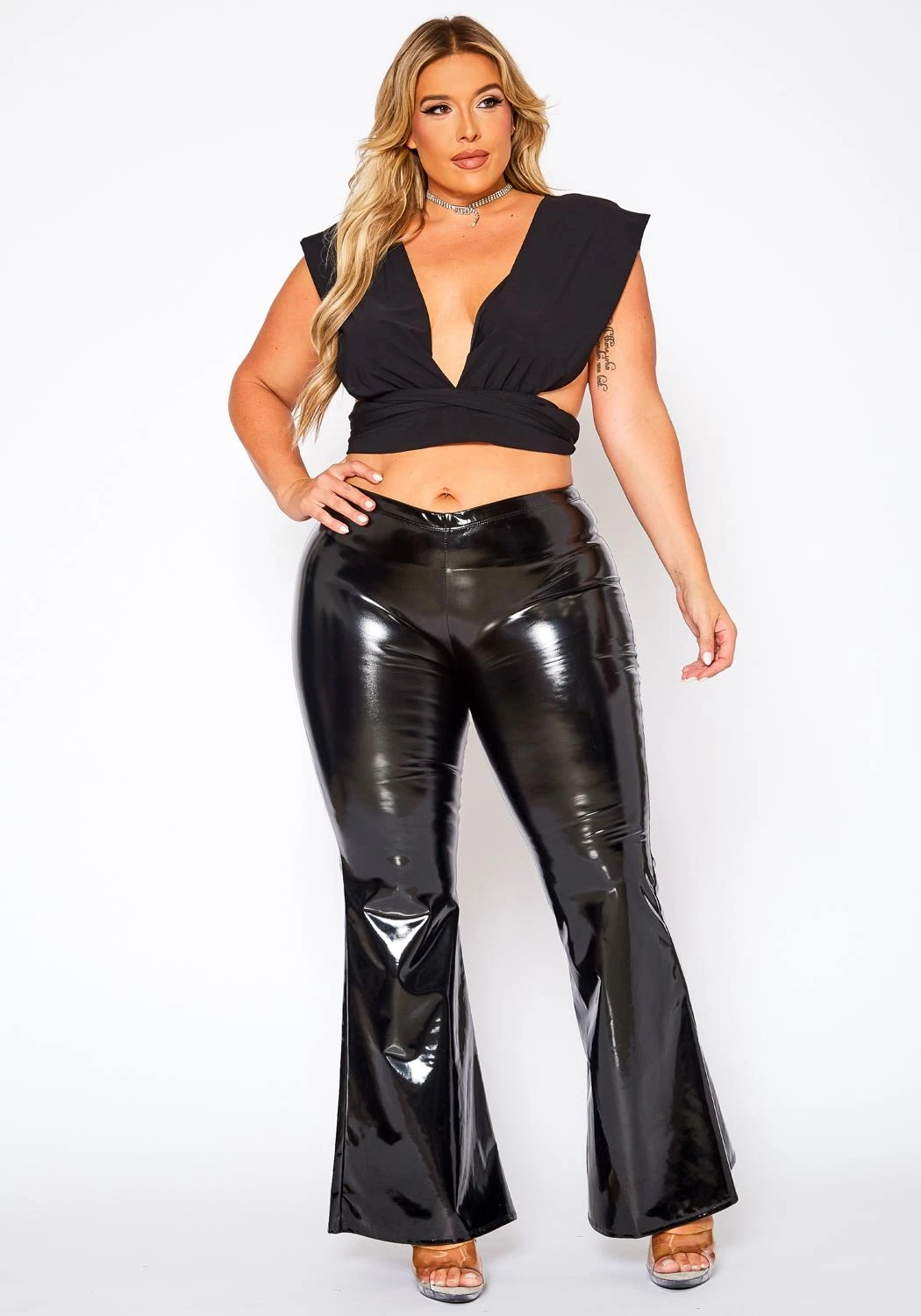 Fashion statement plus size women’s PU leather pants in low rise hem and flare leg design.