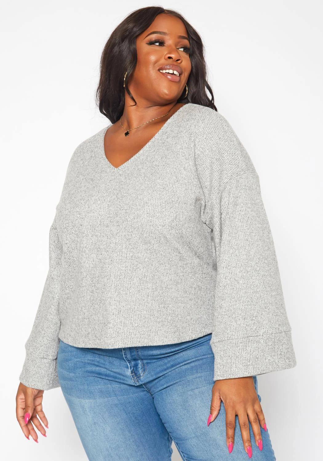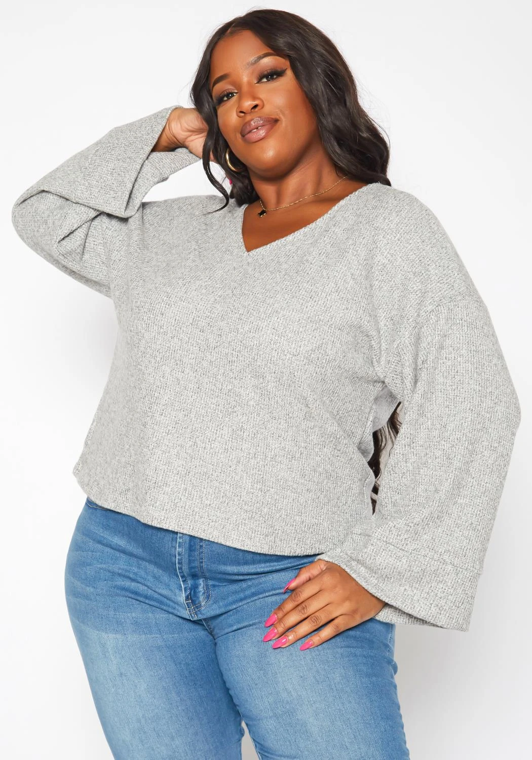 Casual plus size women’s sweater in v-neck style, relaxed fit, open back and loose long sleeves.