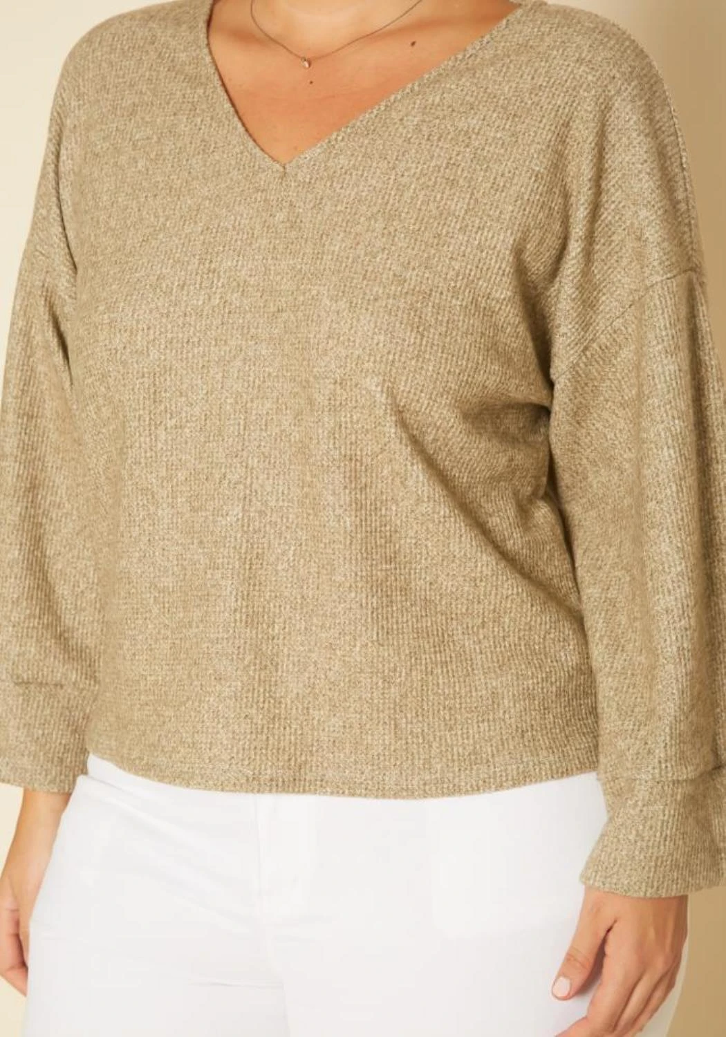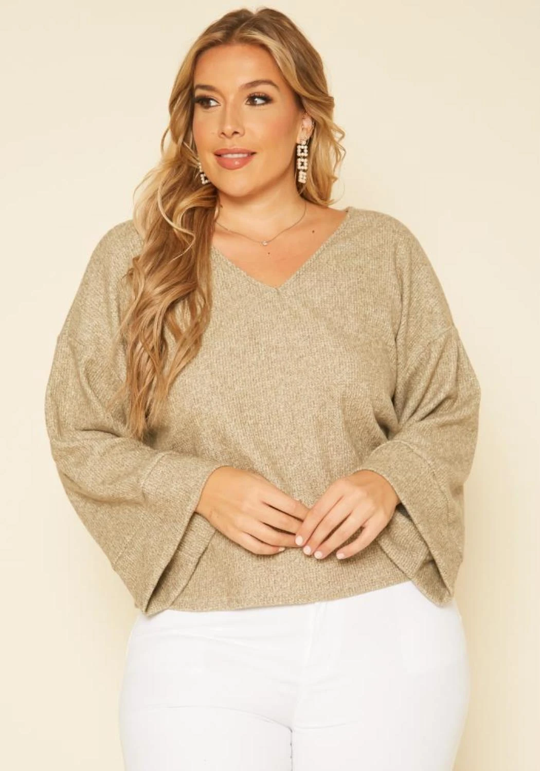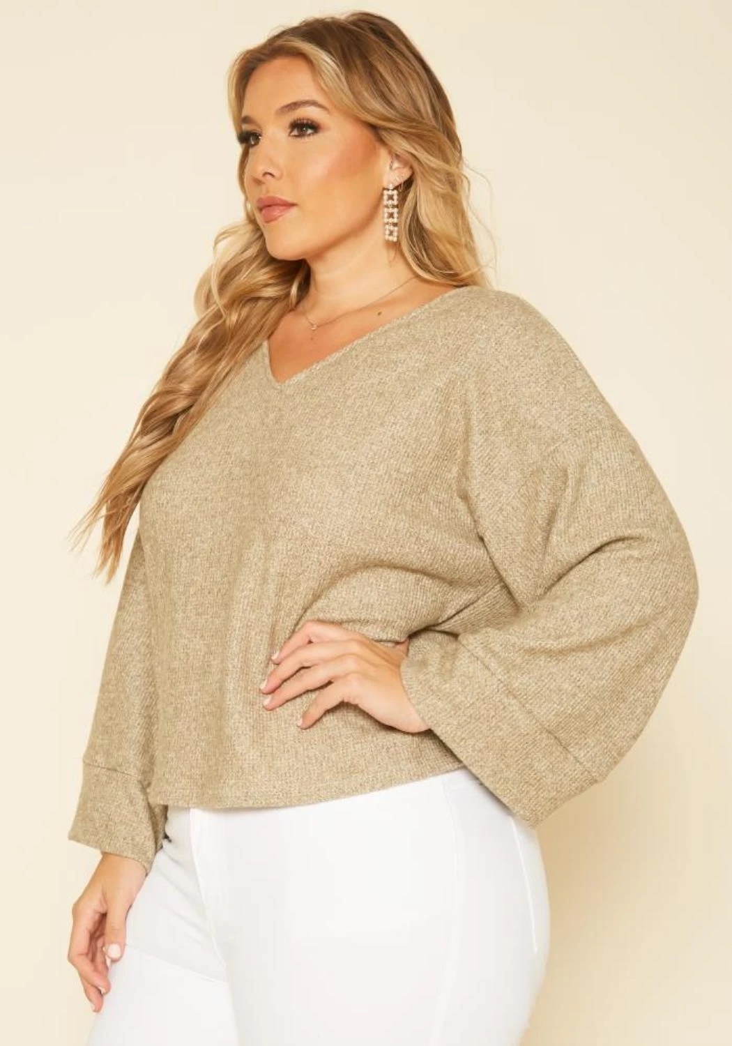 Casual plus size women’s sweater in v-neck style, relaxed fit, open back and loose long sleeves.