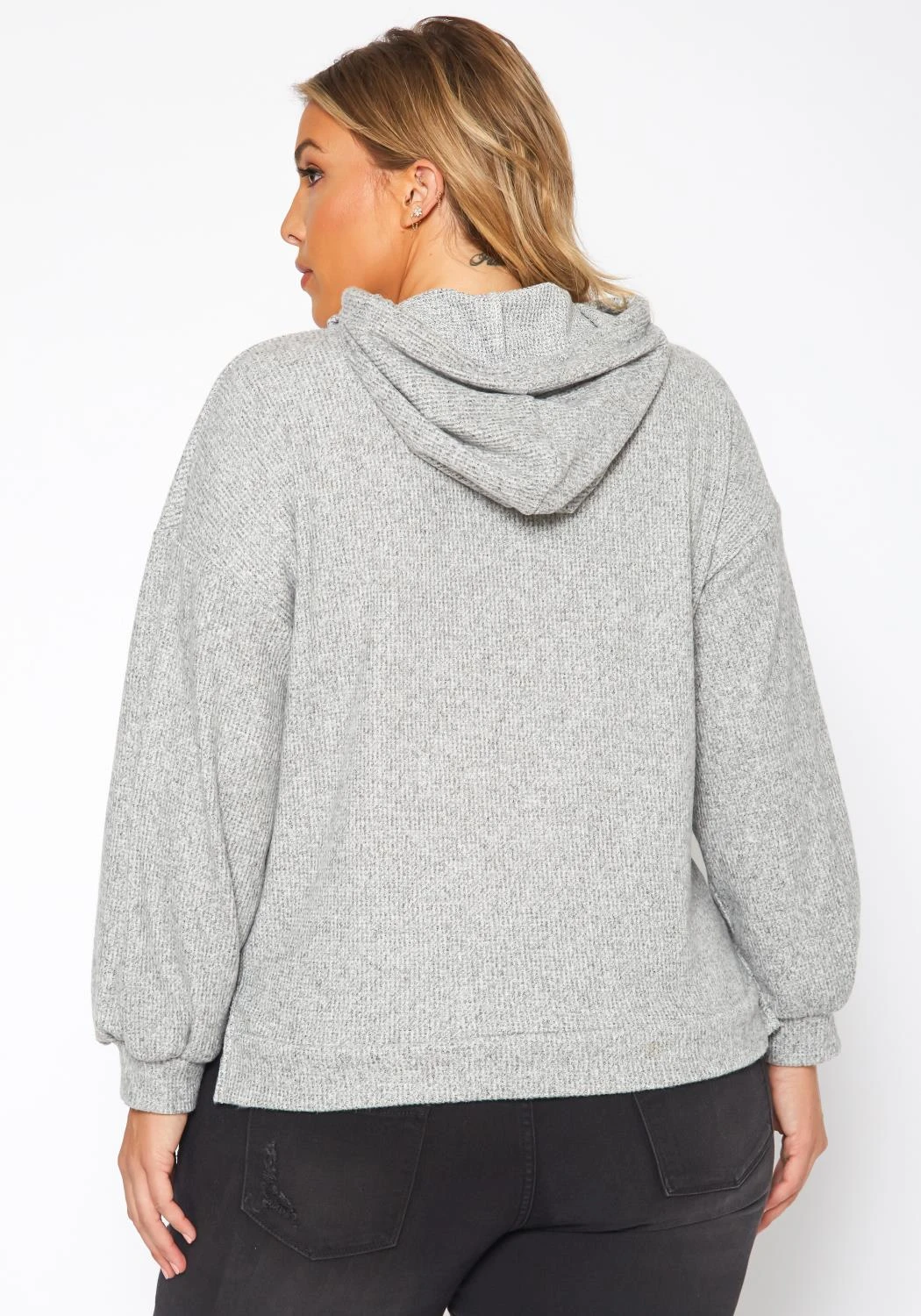 Cozy casual plus size women’s hooded sweater in ribbed knit material, hooded design with drawstring hem and fitted wrist cuffs.