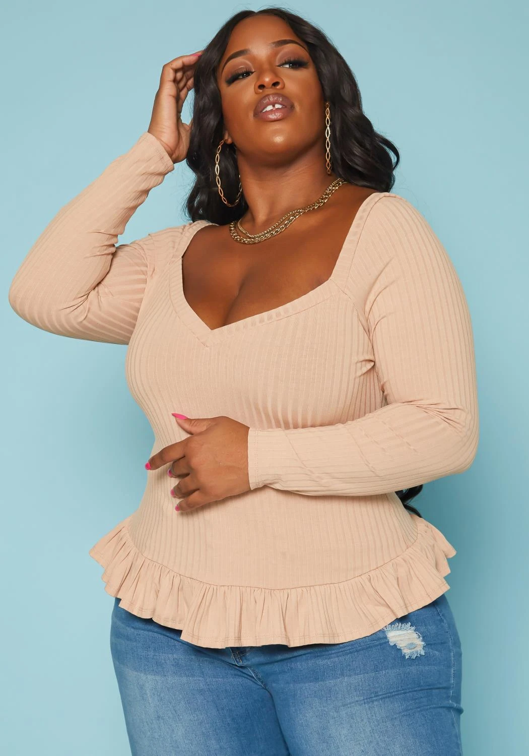Lovely plus size women’s shirt in ribbed knit material, sweetheart neckline, fitted long sleeves and ruffle flare hem.