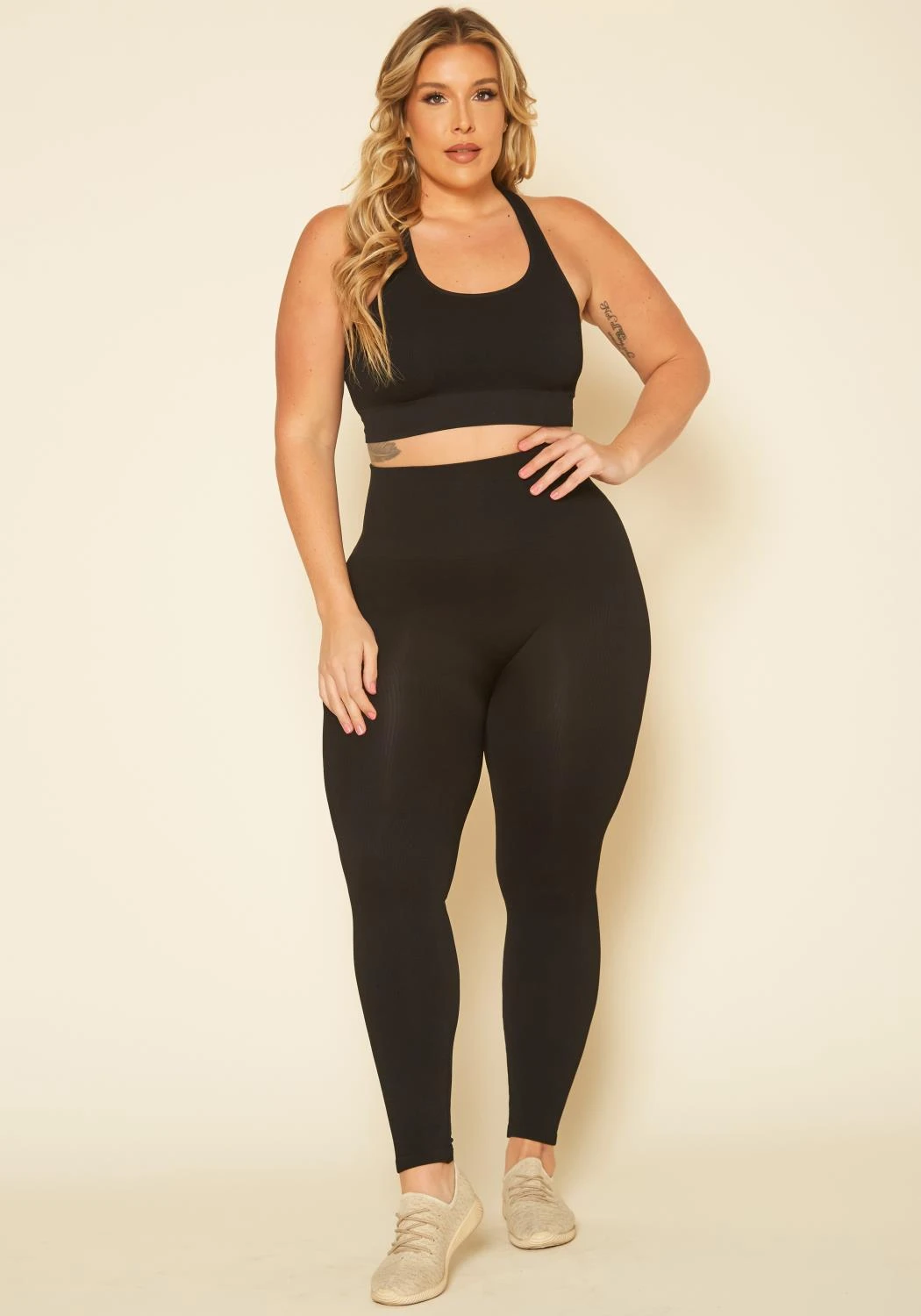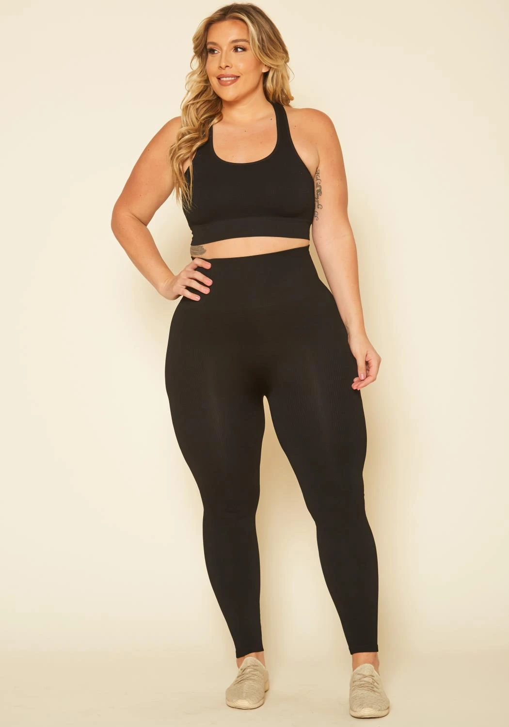 Comfy plus size women’s matching ribbed set which features a scoop neck racerback tank crop top and high waist leggings.