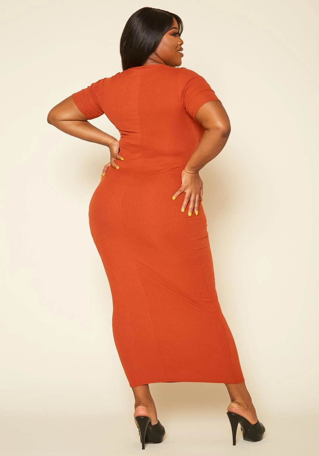 Plus size women’s dress in maxi style, featuring ribbed design, very low round neckline paired with a bandeau, short sleeves and body con fit.