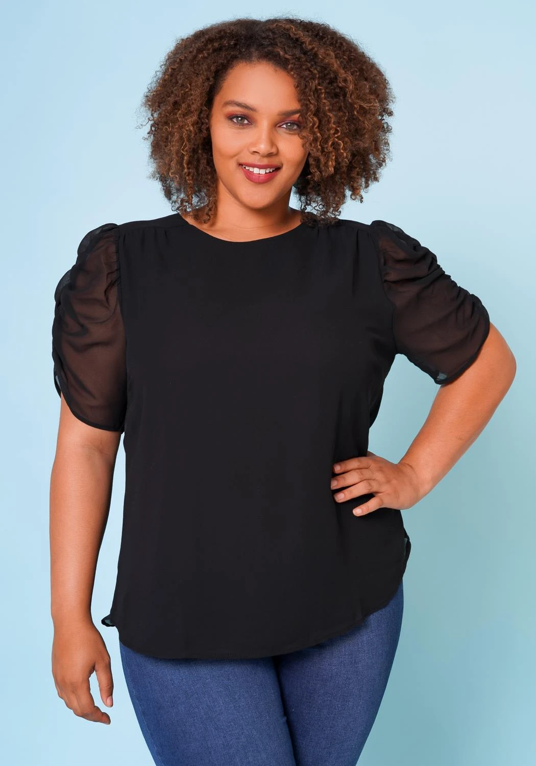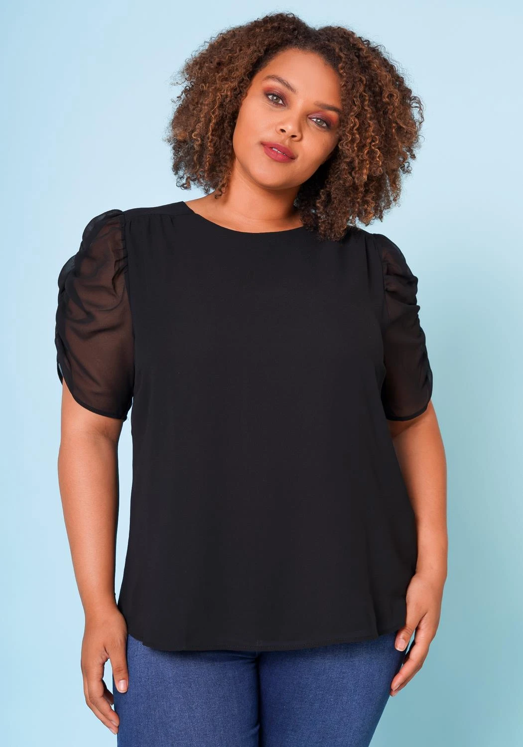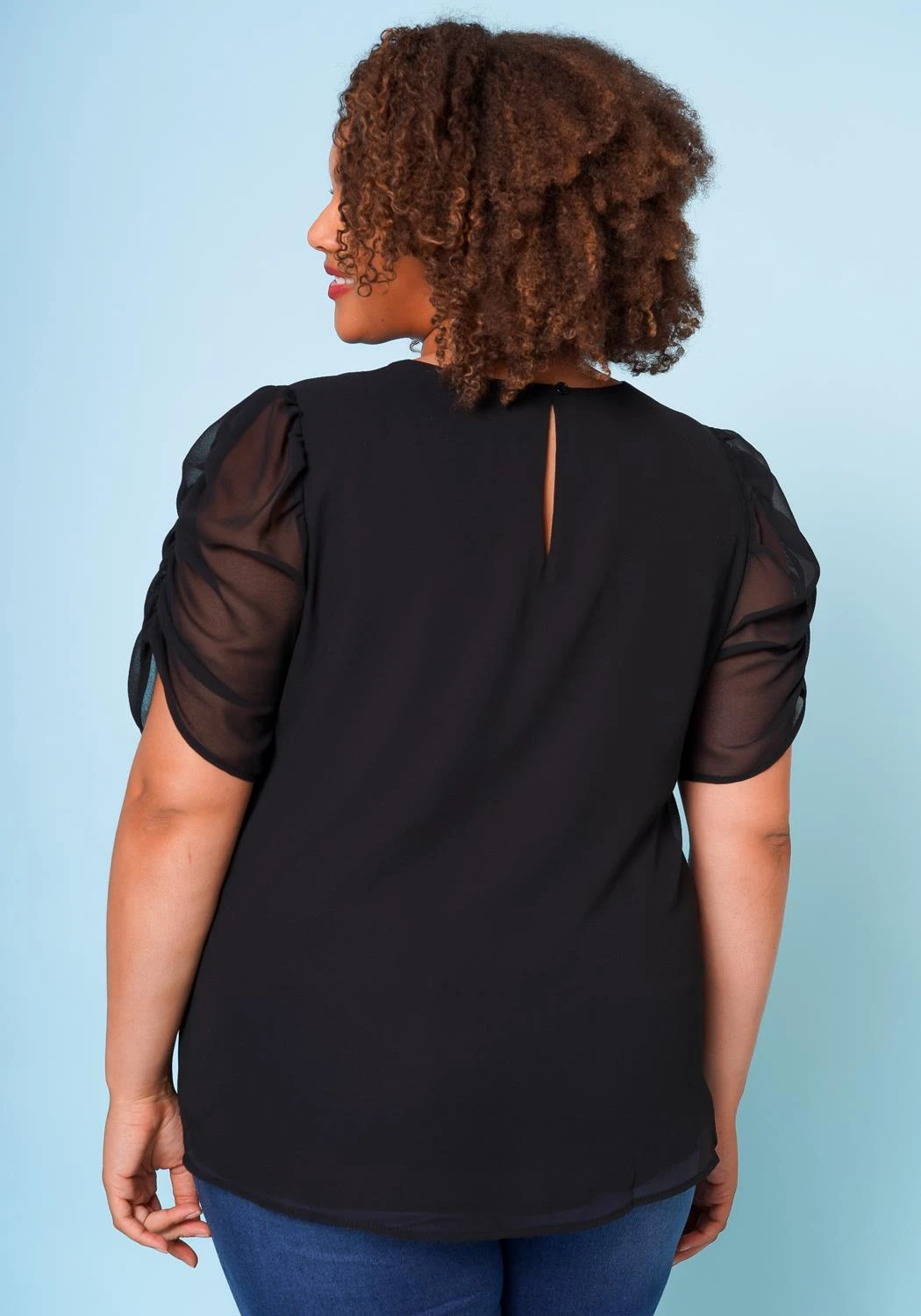 Plus size woman’s relaxed fitted shirt with the details of a ruched sleeve and back button.
