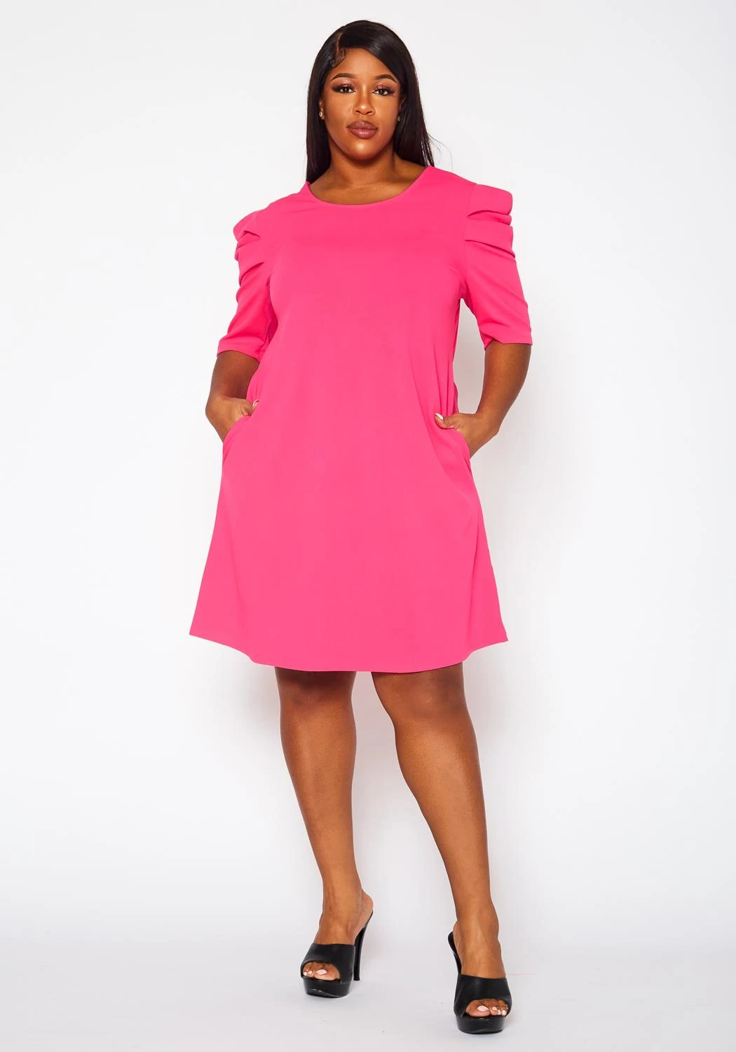 Casual fashion statement plus size women’s mini dress in round neck style, ruffle short sleeves and flare design.
