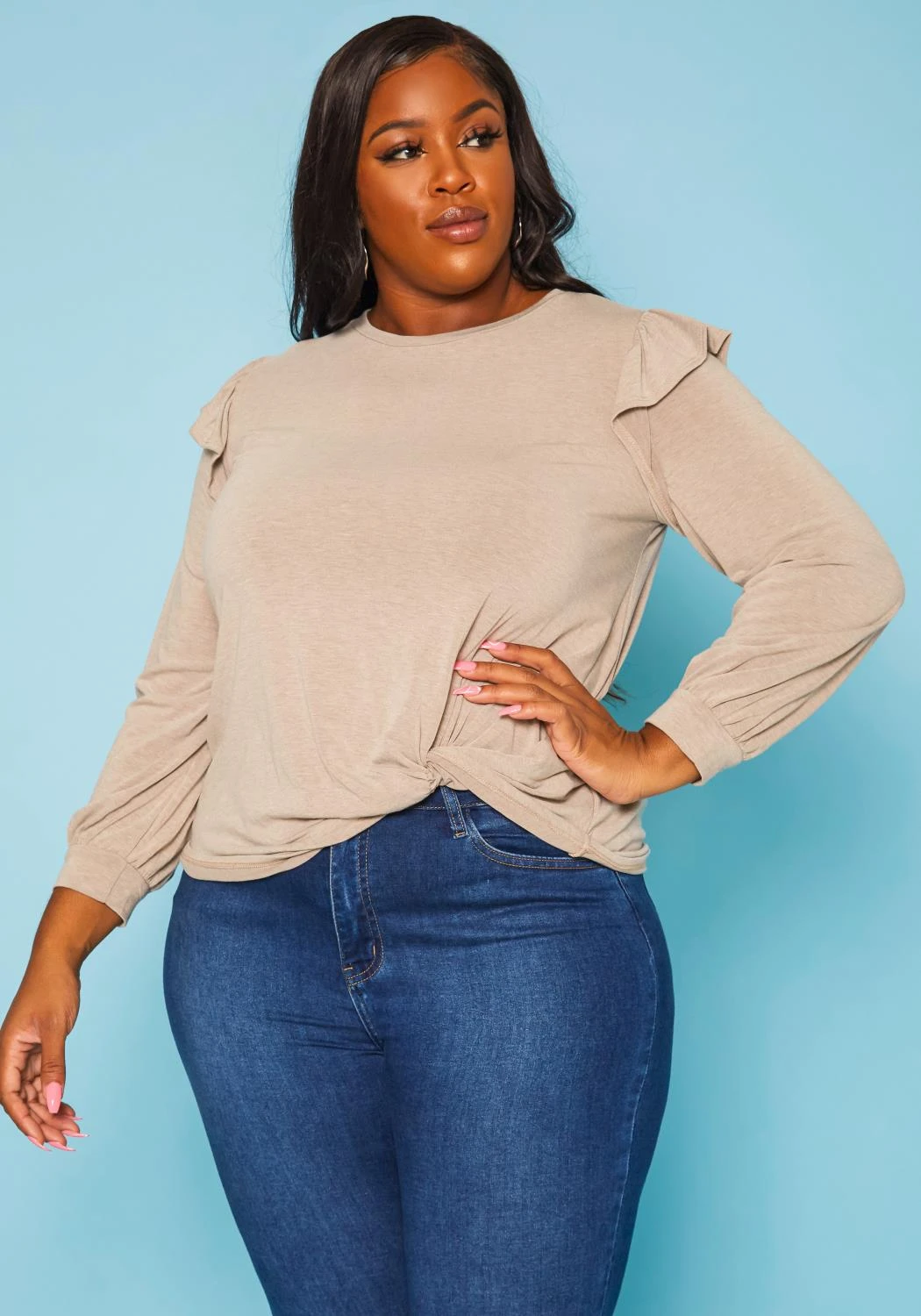 Chic plus size women’s top in round neck style, long sleeves, ruffle trim and twist hem detail.