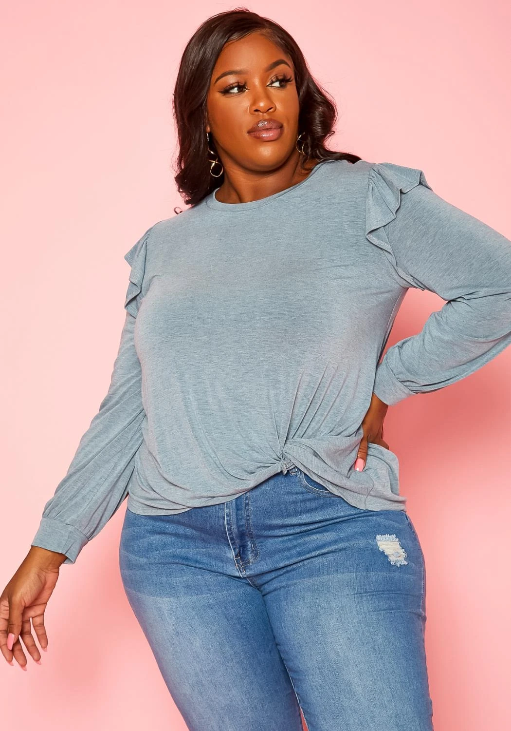 Chic plus size women’s top in round neck style, long sleeves, ruffle trim and twist hem detail.