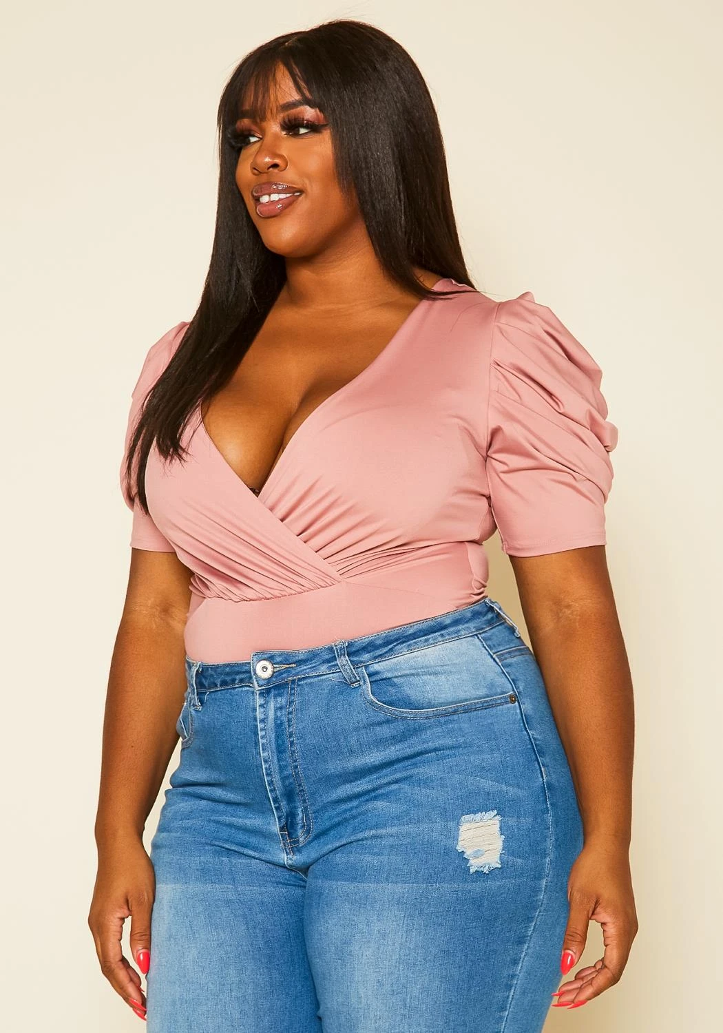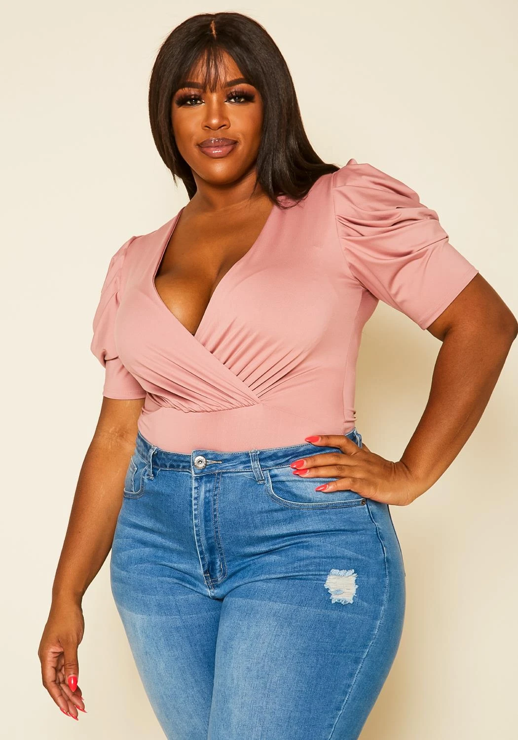 Plus size women’s top in bodysuit style, featuring a deep v-neck hem, short ruffled sleeves with snap on crotch closure.