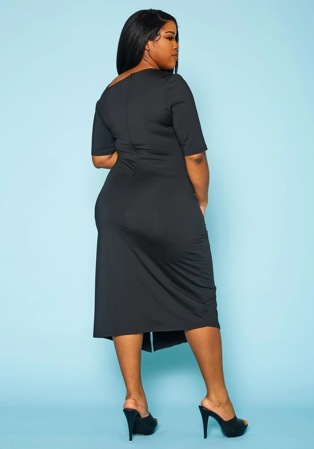 Plus size women’s bodycon dress that features safety pin adornments, asymmetric neckline, fitted short sleeves, front slit hem, midi length and back zipper closure.