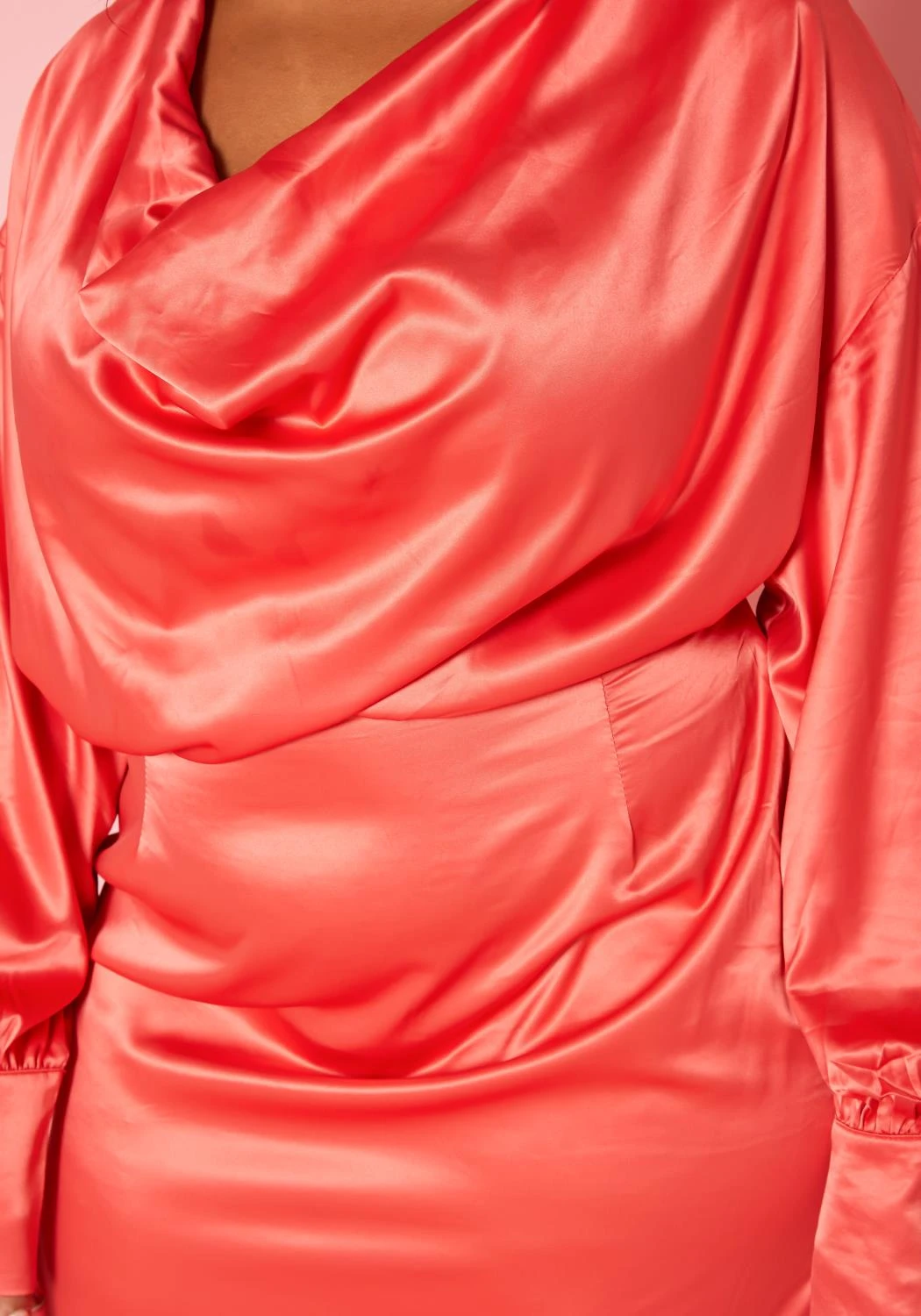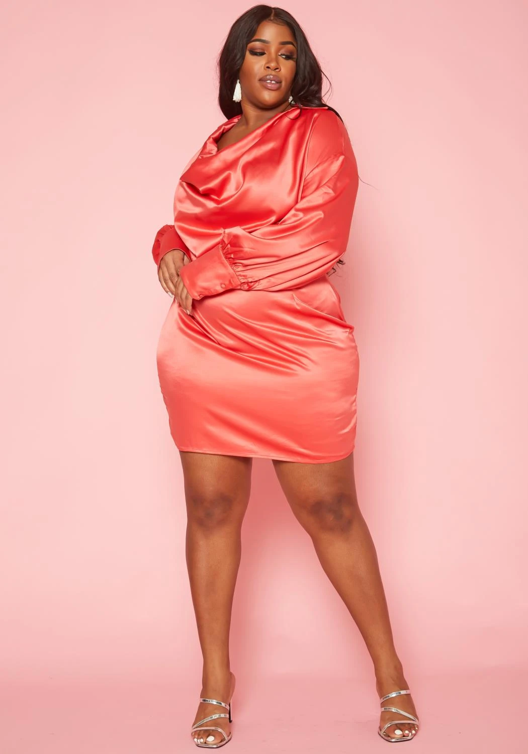 Gorgeous plus size women’s mini dress in satin material, cowl neck style, long sleeves, buttoned wrist cuffs and elastic waistline.