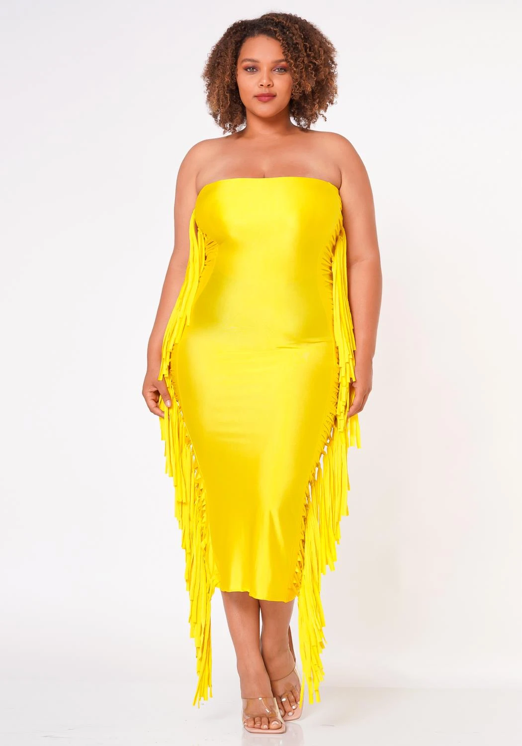 Leveled up plus size women’s bodycon tube dress with double sided fringe hem details and quality sheen material.