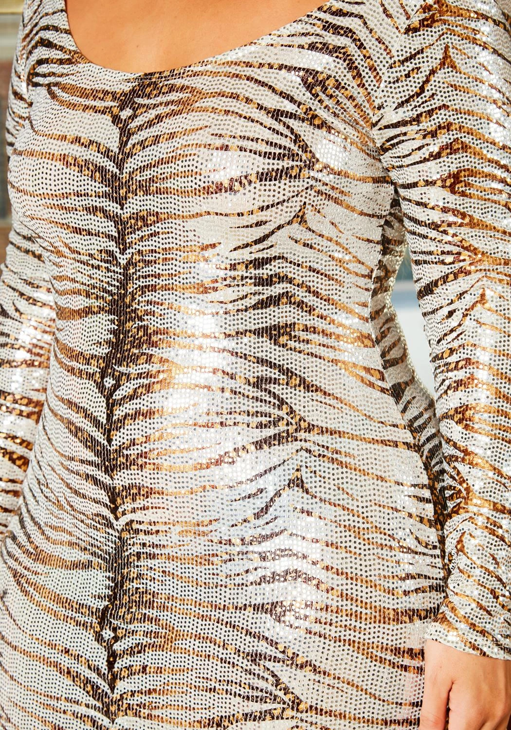 Stunning bodycon mini dress for plus size women in silver sequin animal pattern. Features a scoop neckline and fitted long sleeves. Belt sold separately.