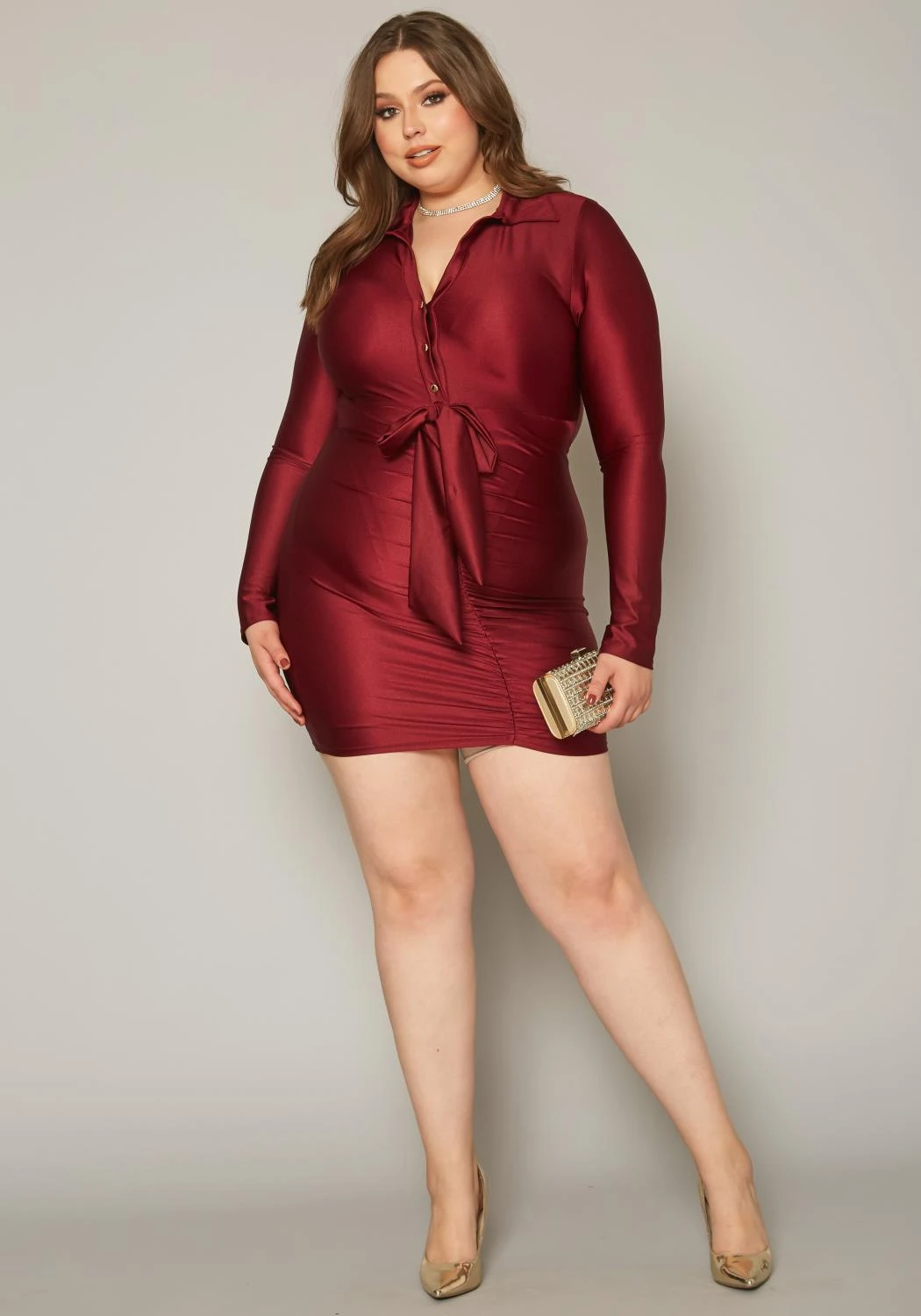Stunning plus size women’s mini dress in collar neck style, button front closure, tie front detail, fitted long sleeves and ruched details.