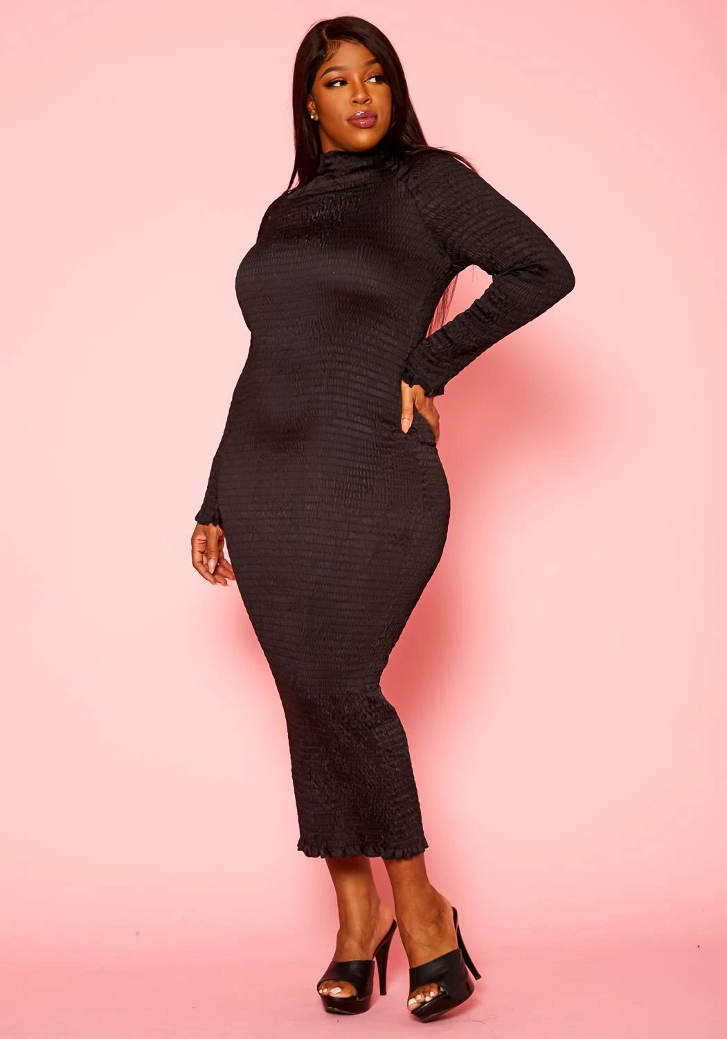 The perfect solid color plus size women’s dress with full smocked material design, high neck style, fitted long sleeves and lettuce trim details.