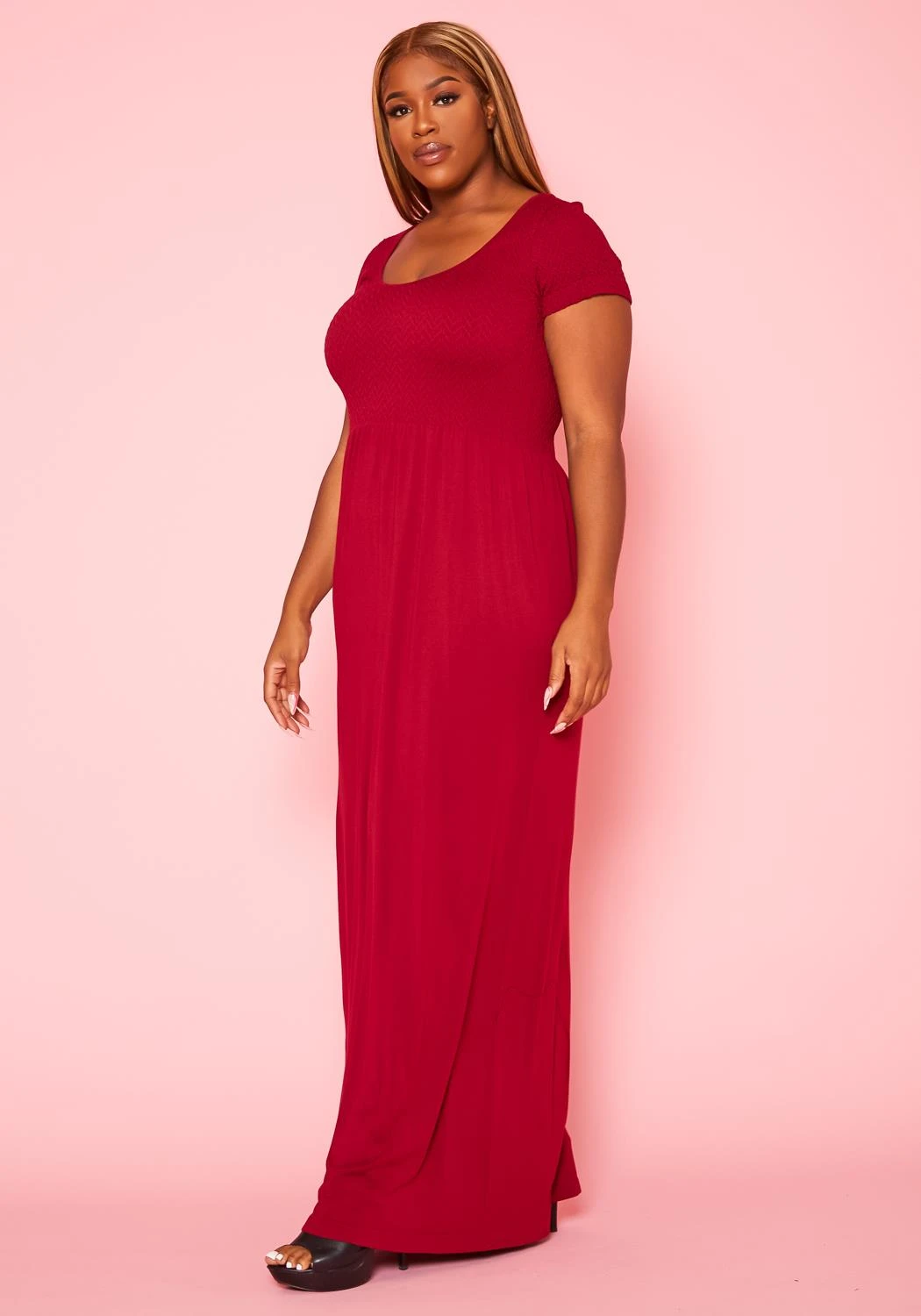 Lovely basic fit & flare maxi dress for plus size women in scoop neck style, short sleeves and smocked hem top.