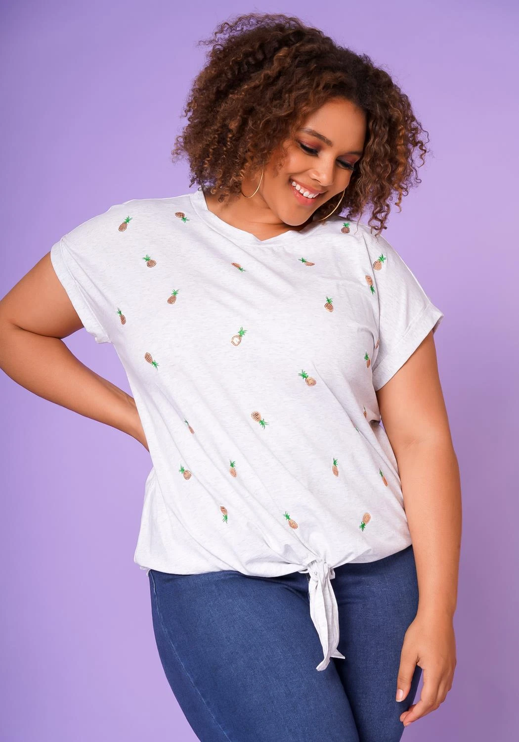 Easy to style crew neck summer shoulder tee with pineapple print design.