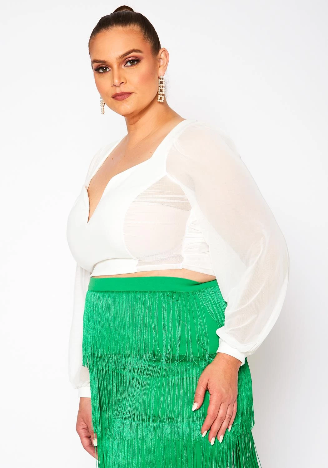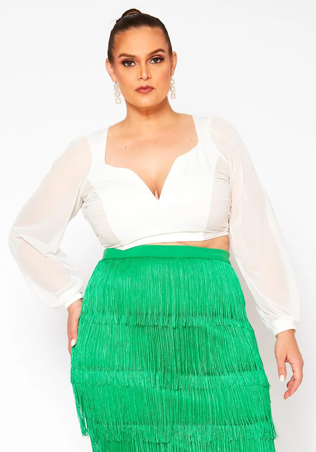 Lovely plus size women’s crop top in sweetheart neckline, chiffon long sleeves, back tie closure and open back design.