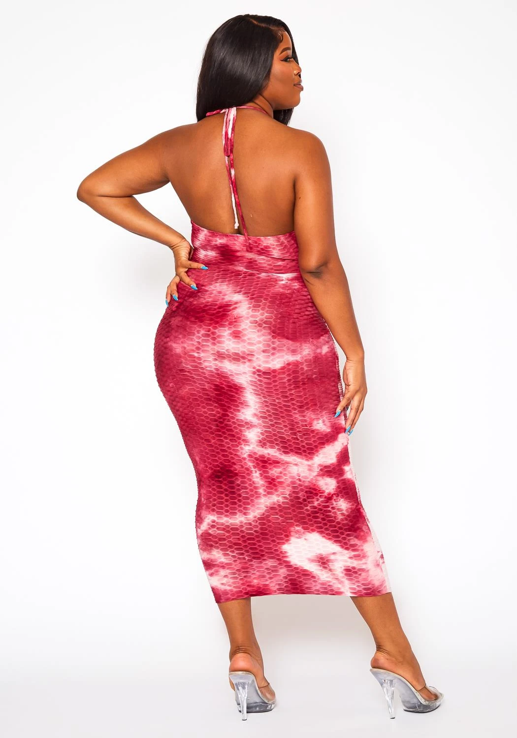 Gorgeous plus size women’s forever trending cut-out front midi dress with halter top neck style, back & front tie up closure, front key-hole design & textured material.