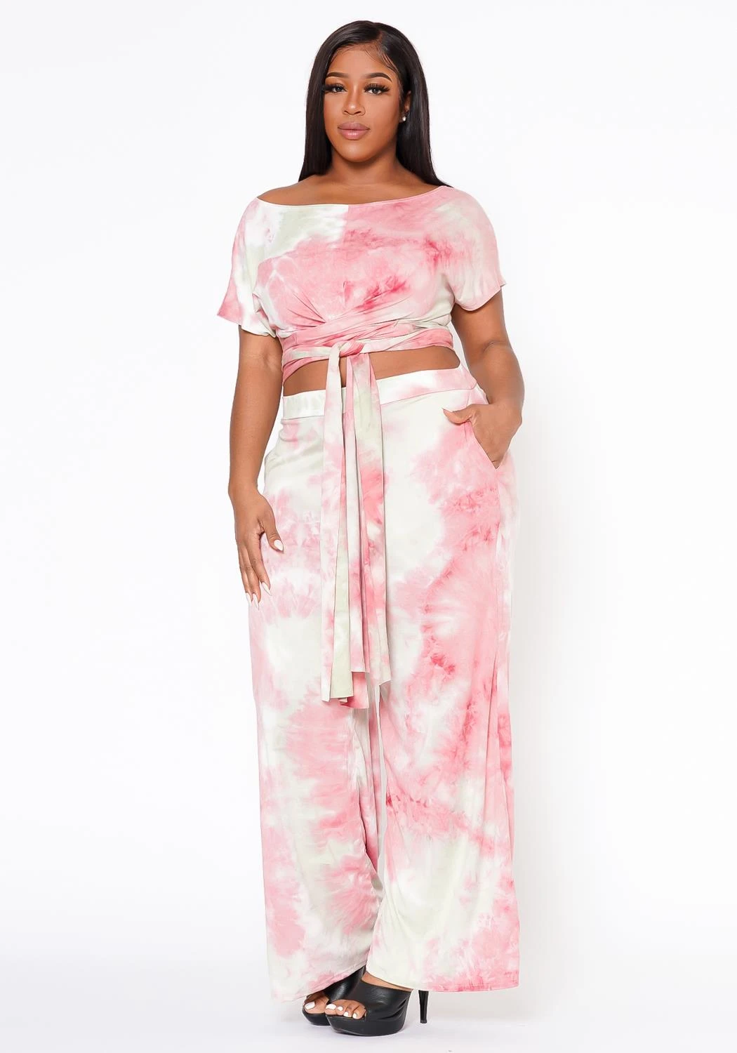 Lovely plus size women’s matching set which features a tie dye boat neckline, tie front crop top and matching high waist straight fit pants with pocket hem.
