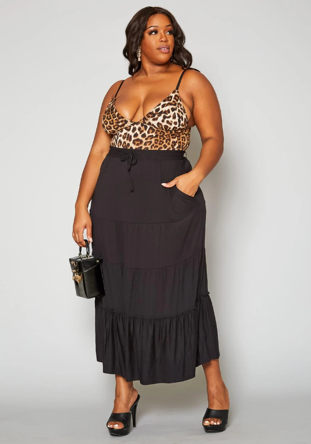 Lovely plus size women’s maxi skirt in tiered design, high waist style, bow ascent and pocket hem.