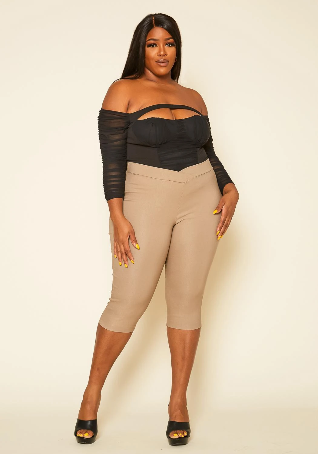Plus size women’s pants in capri style featuring a v front detail.