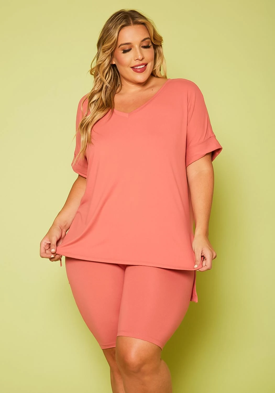 Plus size women’s two piece set featuring a high low, side slit detail, v-neck & rolled up detailed short sleeves t-shirt, paired with high- waist biker shorts.