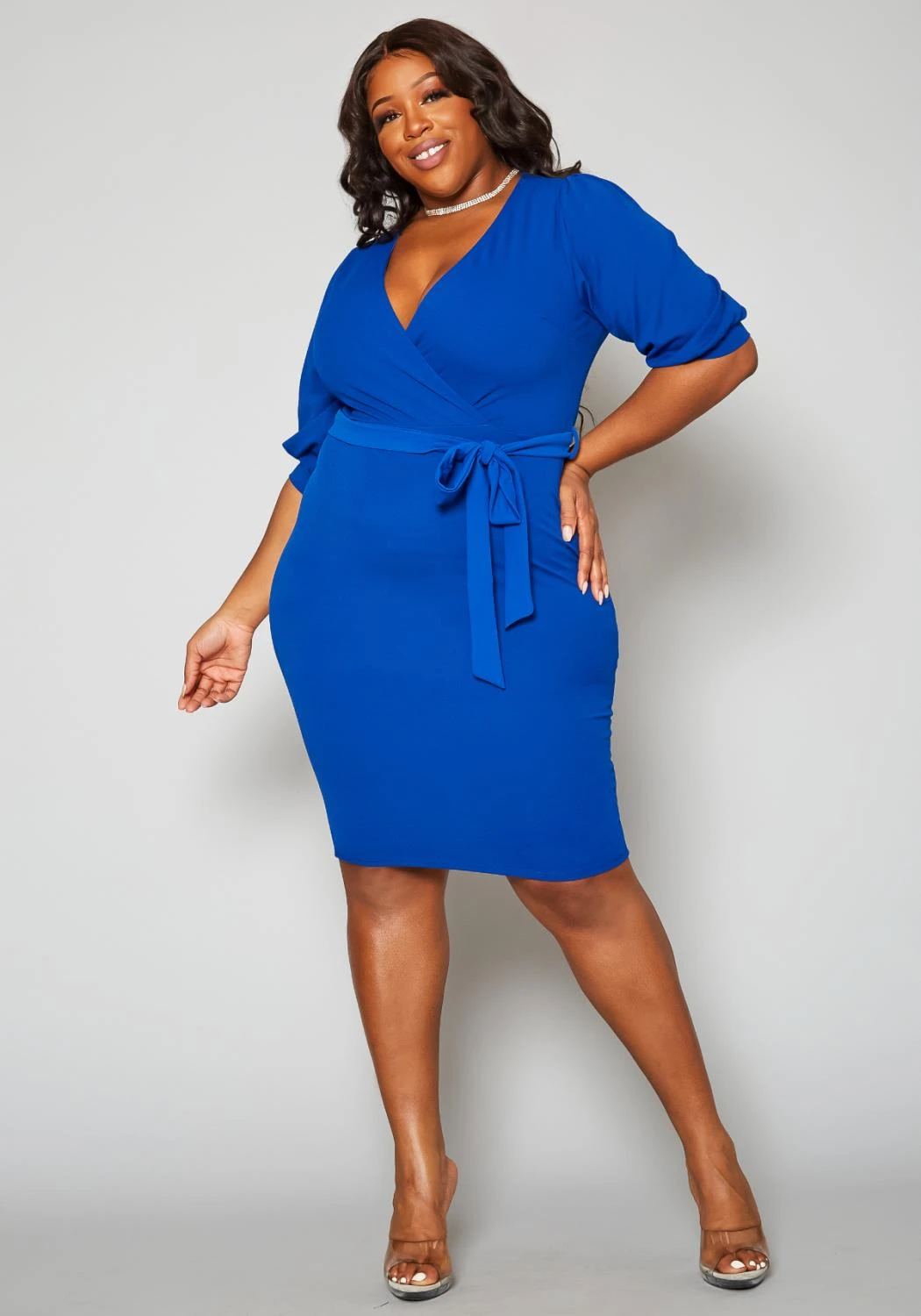 Special occasion ready plus size women’s bodycon mini dress which features a v-neck wrap design, waist tie ascent, half sleeves with puffy design and back centered slit hem.