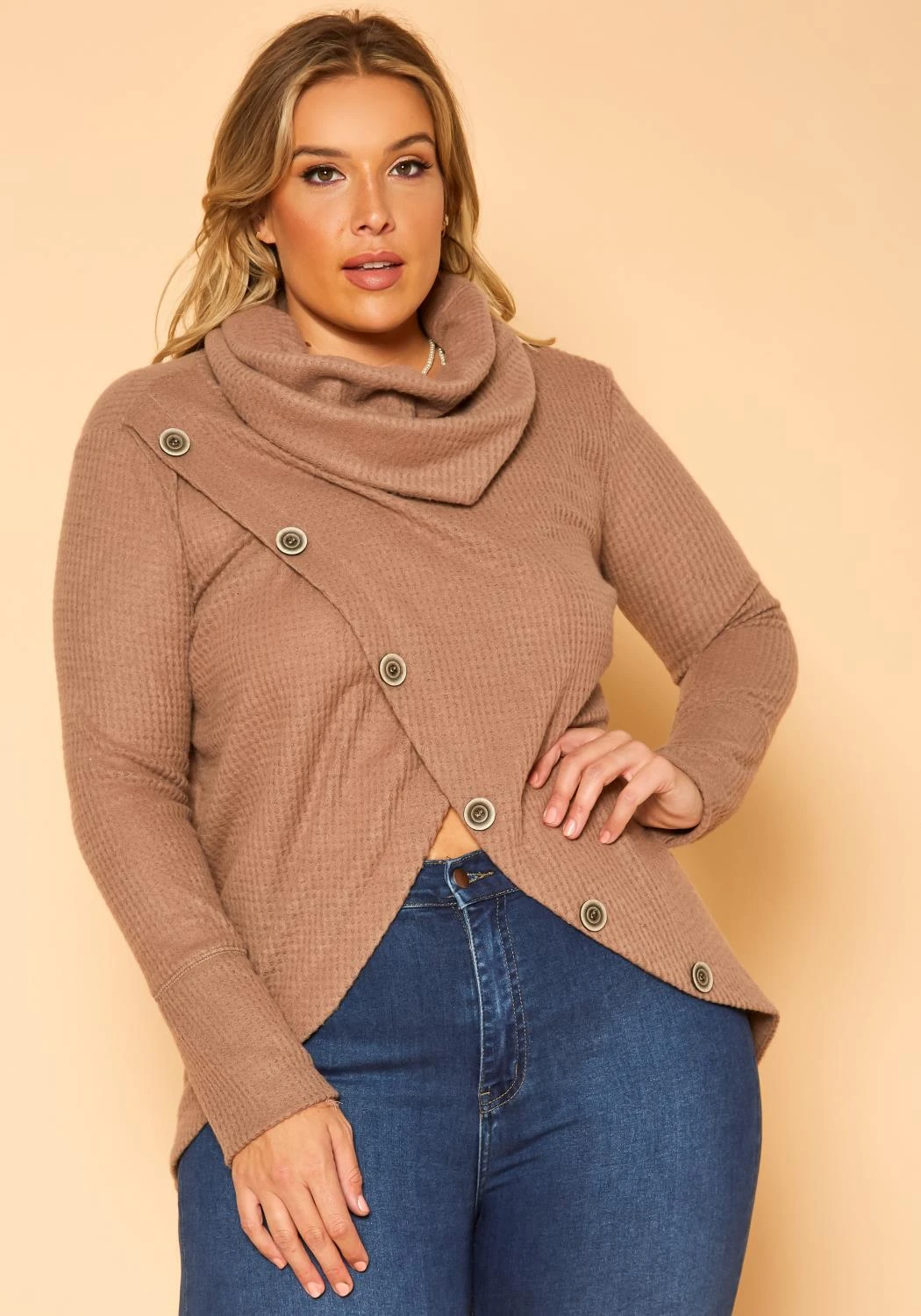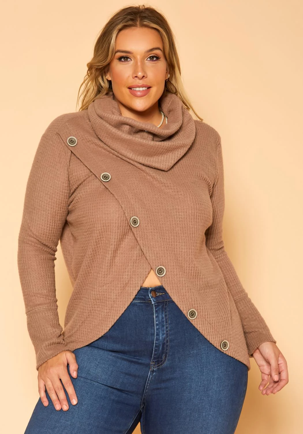 Casual yet stylish plus size women’s sweater in funnel neck style, waffle knit material, asymmetric overlay hem and button details.