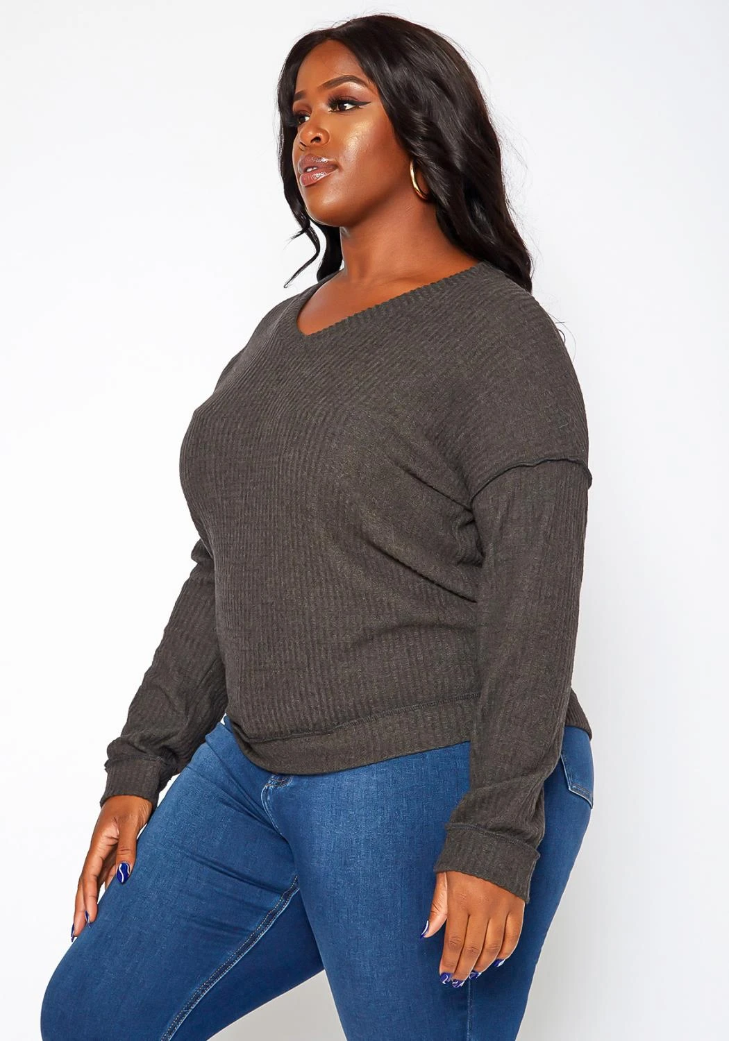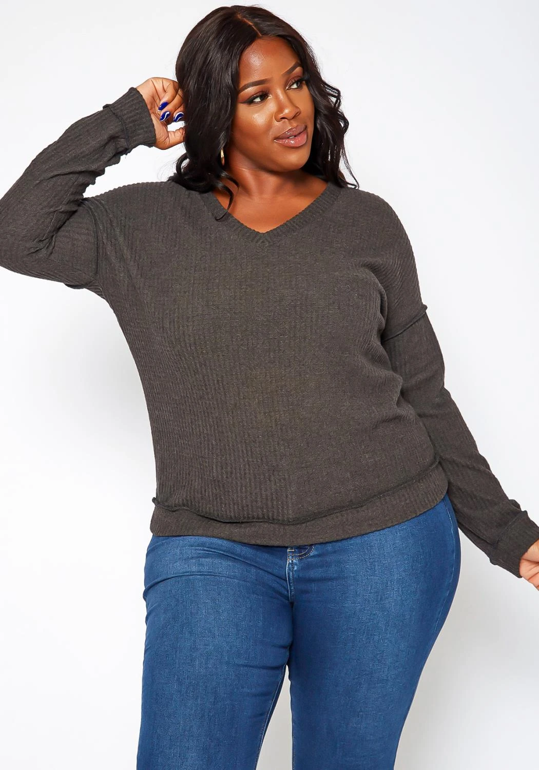 Must have knit sweater top in waffle knit material, v-neck style, drop shoulder long sleeves and stitch trim detail.