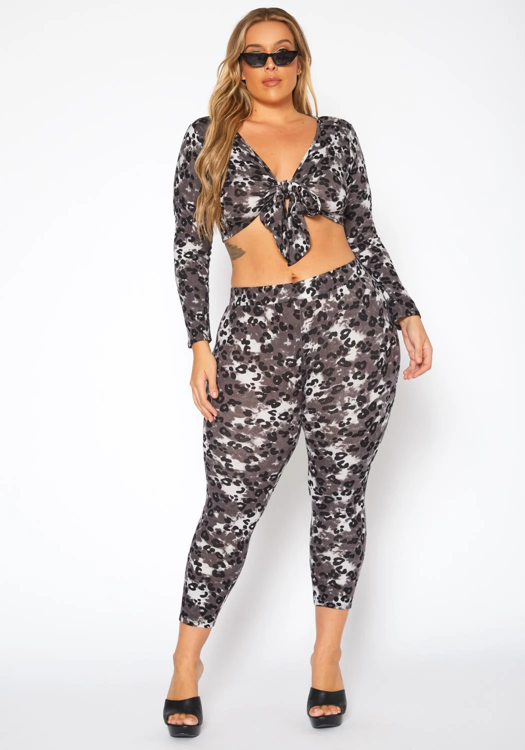 One of a kind plus size women’s two piece set in leopard print. Features a tie-front, v-neck style, long sleeve crop top and mid rise leggings.