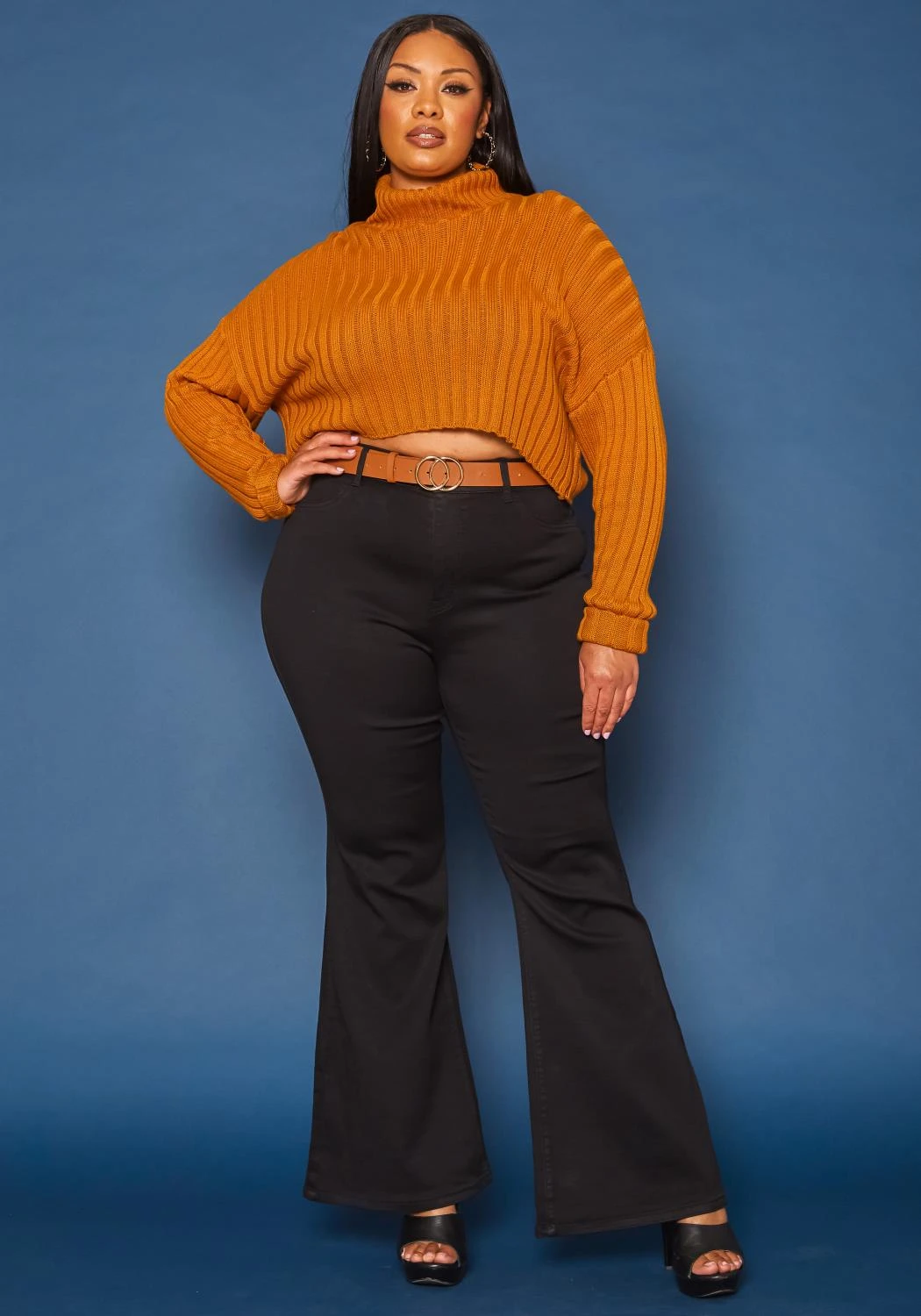 Asoph x Vibrant plus size women’s bell bottom flared jean that enhances bum and features high waist style, pockets and belt loop holes.