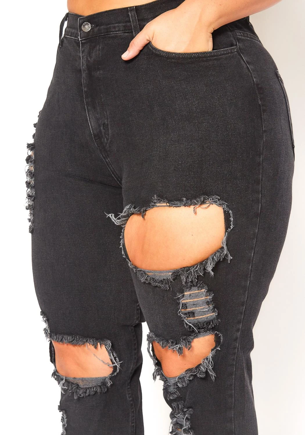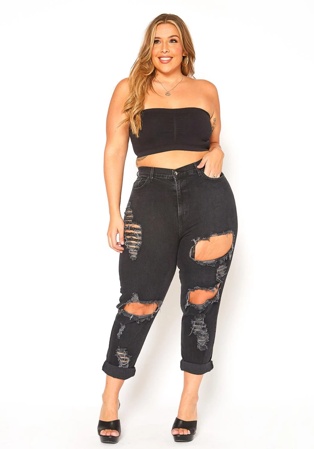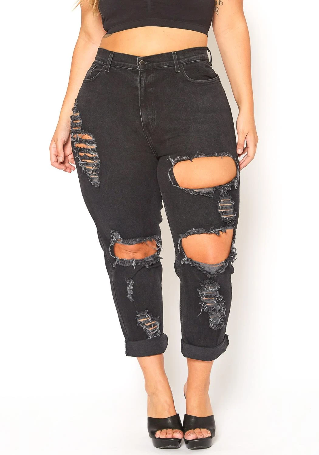 Trendy and comfy plus size women’s denim mom jeans with front distress design, functional pockets, belt loop holes and ankle fold hem.