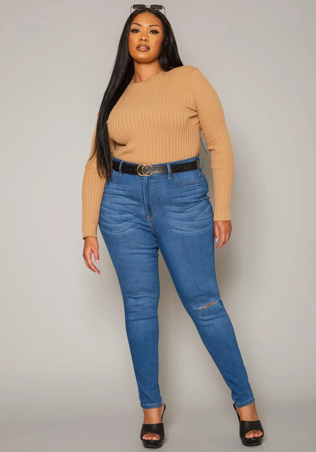 Asoph x Vibrant plus size women’s skinny mid rise denim jeans plus featuring a classic knee rip hem, belt loop holes and pockets.